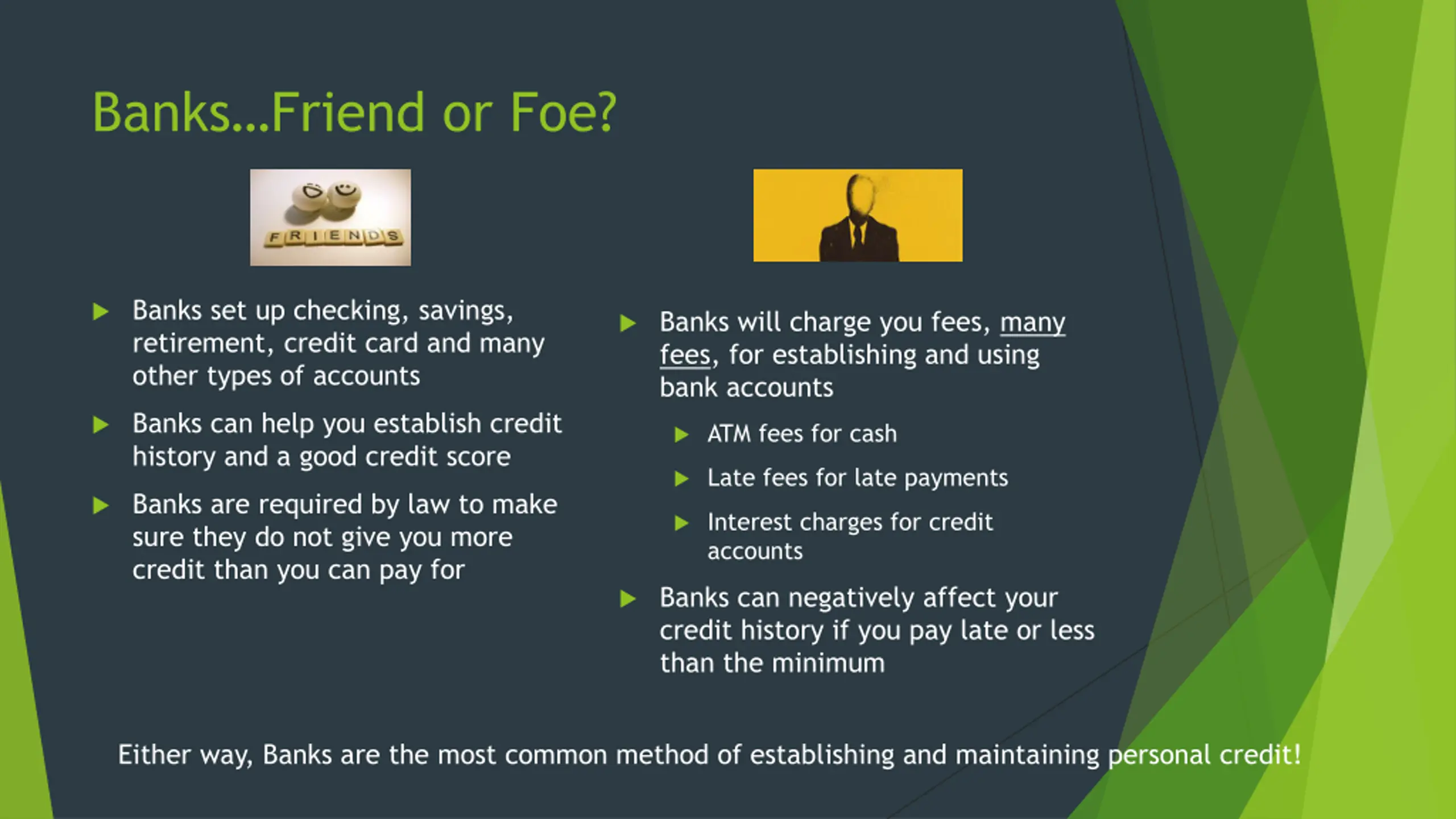 BanksFriend or Foe? Banks set up checking, savings, retirement, credit card and many other types of accounts Banks will charge you fees, many fees, for establishing and using bank accounts Banks can help you establish credit history and a good credit score ATM fees for cash Late fees for late payments Banks are required by law to make sure they do not give you more credit than you can pay for Interest charges for credit accounts Banks can negatively affect your credit history if you pay late or less than the minimum Either way, Banks are the most common method of establishing and maintaining personal credit!