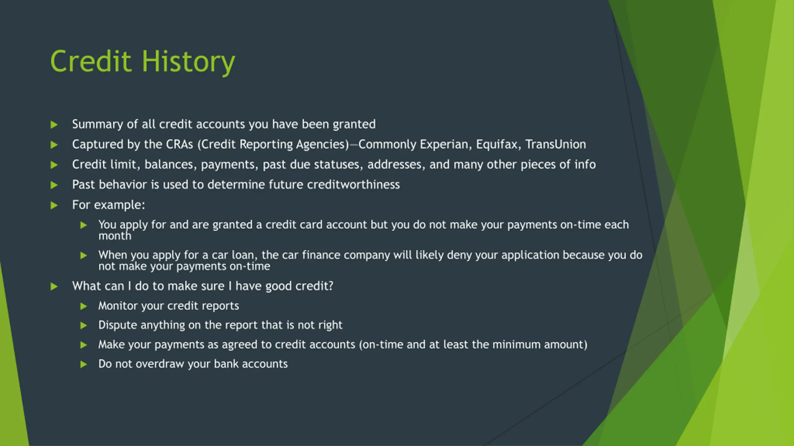 Credit History Summary of all credit accounts you have been granted Captured by the CRAs (Credit Reporting Agencies) Commonly Experian, Equifax, TransUnion Credit limit, balances, payments, past due statuses, addresses, and many other pieces of info Past behavior is used to determine future creditworthiness For example: You apply for and are granted a credit card account but you do not make your payments on-time each month When you apply for a car loan, the car finance company will likely deny your application because you do not make your payments on-time What can I do to make sure I have good credit? Monitor your credit reports Dispute anything on the report that is not right Make your payments as agreed to credit accounts (on-time and at least the minimum amount) Do not overdraw your bank accounts