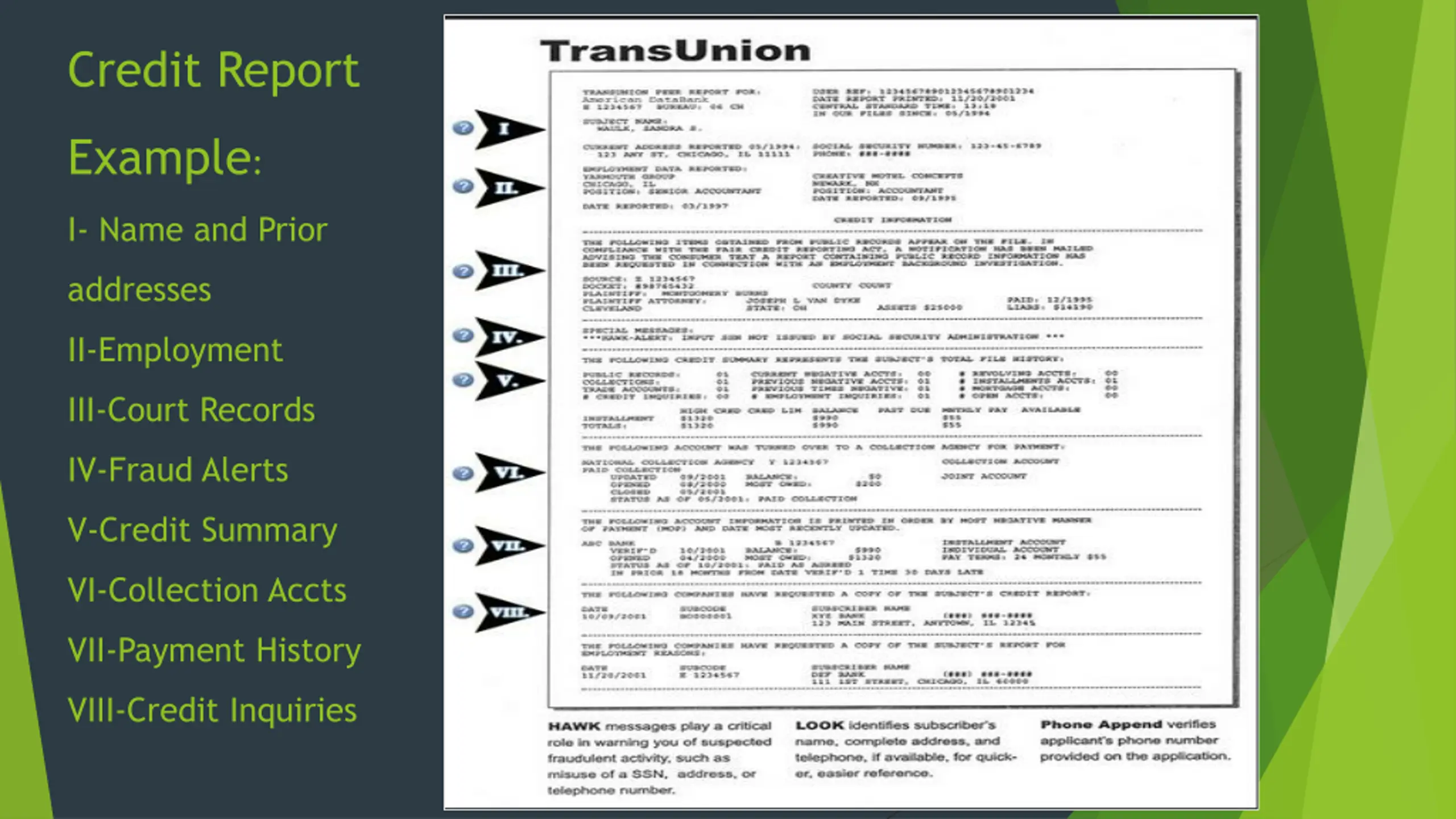 Credit Report Example: I- Name and Prior addresses II-Employment III-Court Records IV-Fraud Alerts V-Credit Summary VI-Collection Accts VII-Payment History VIII-Credit Inquiries