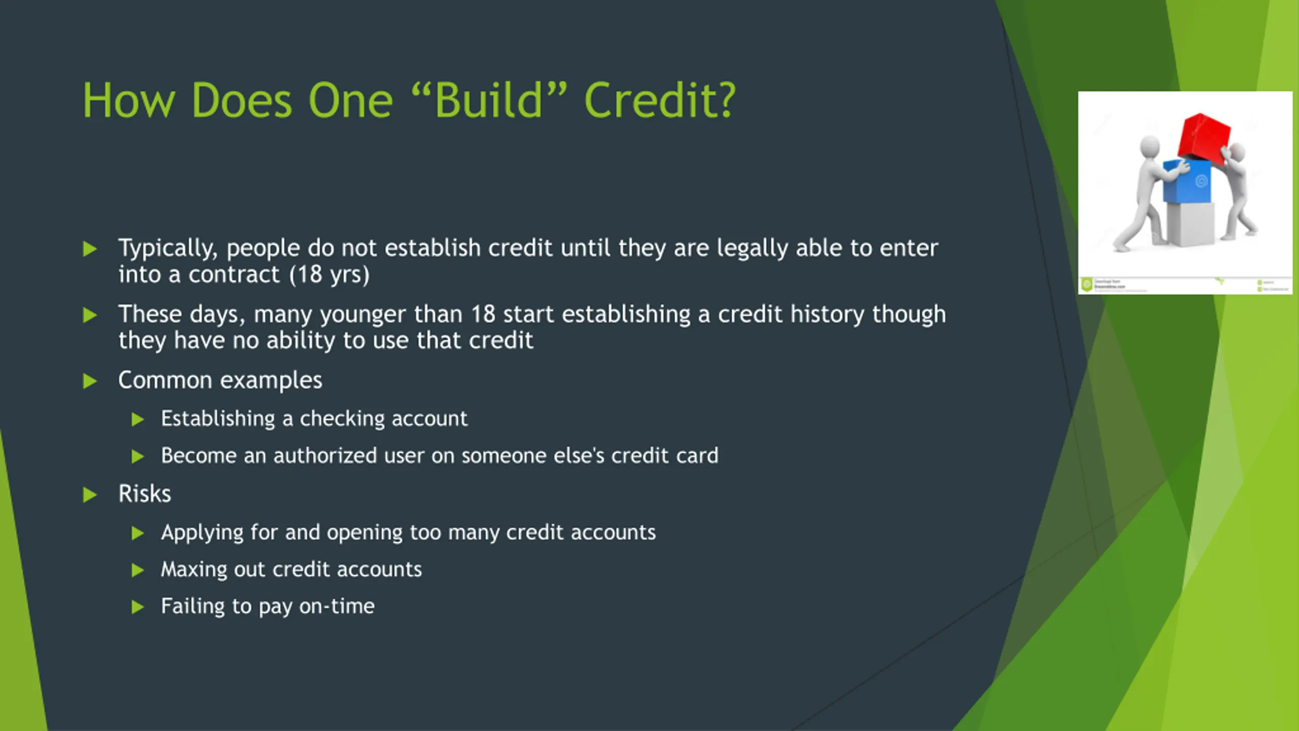 How Does One Build Credit? Typically, people do not establish credit until they are legally able to enter into a contract (18 yrs) These days, many younger than 18 start establishing a credit history though they have no ability to use that credit Common examples Establishing a checking account Become an authorized user on someone else's credit card Risks Applying for and opening too many credit accounts Maxing out credit accounts Failing to pay on-time