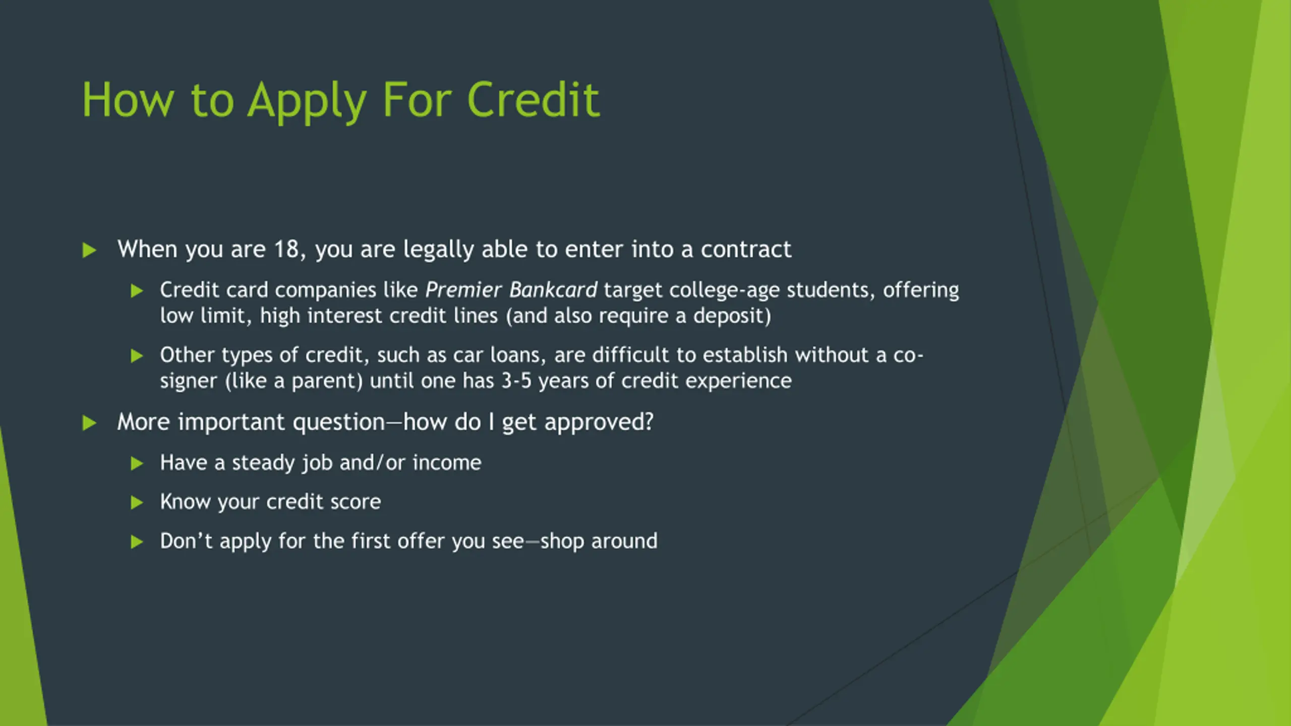 How to Apply For Credit When you are 18, you are legally able to enter into a contract Credit card companies like Premier Bankcard target college-age students, offering low limit, high interest credit lines (and also require a deposit) Other types of credit, such as car loans, are difficult to establish without a co- signer (like a parent) until one has 3-5 years of credit experience More important question how do I get approved? Have a steady job and/or income Know your credit score Don t apply for the first offer you see shop around