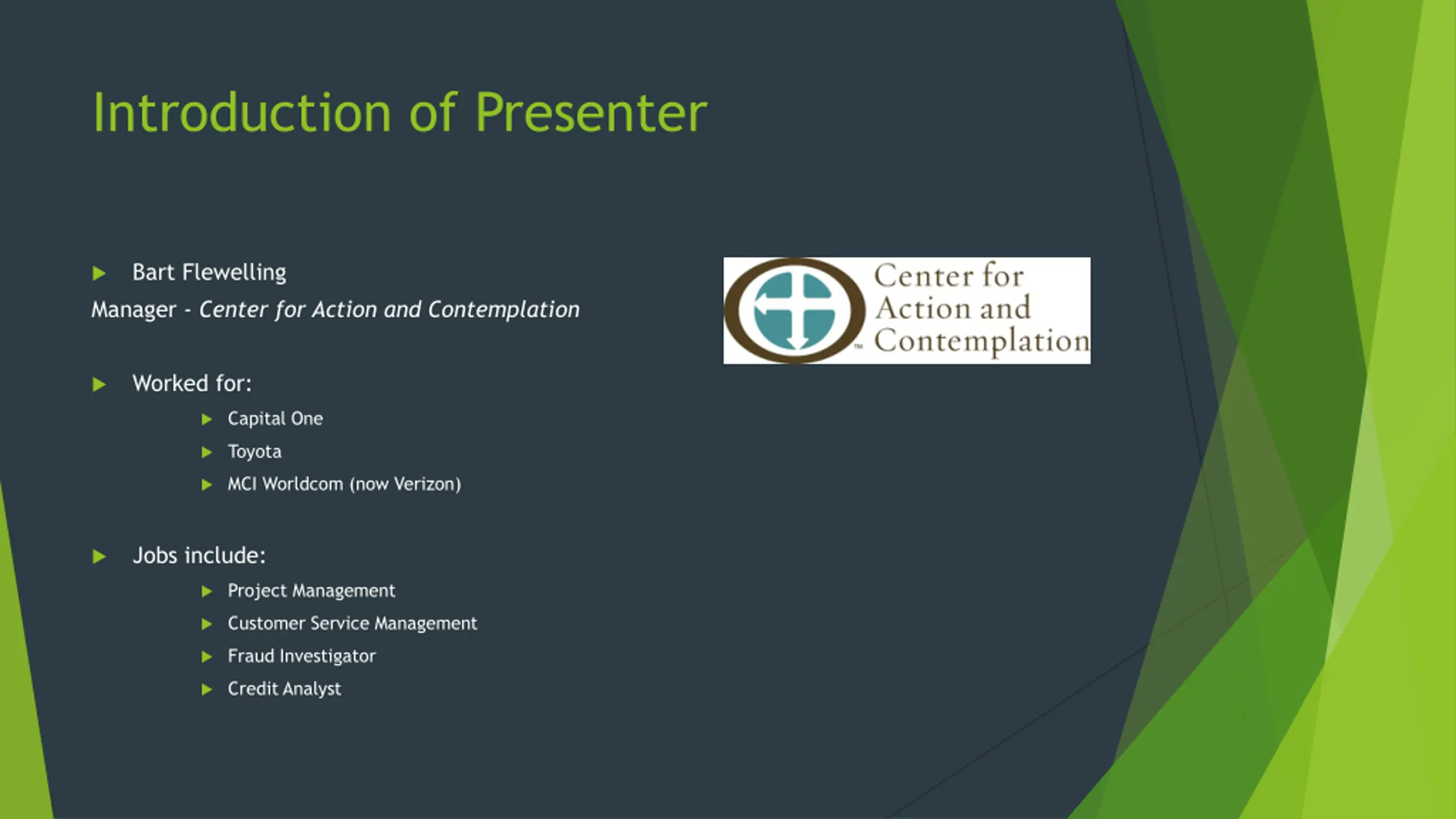 Introduction of Presenter Bart Flewelling Manager - Center for Action and Contemplation Worked for: Capital One Toyota MCI Worldcom (now Verizon) Jobs include: Project Management Customer Service Management Fraud Investigator Credit Analyst