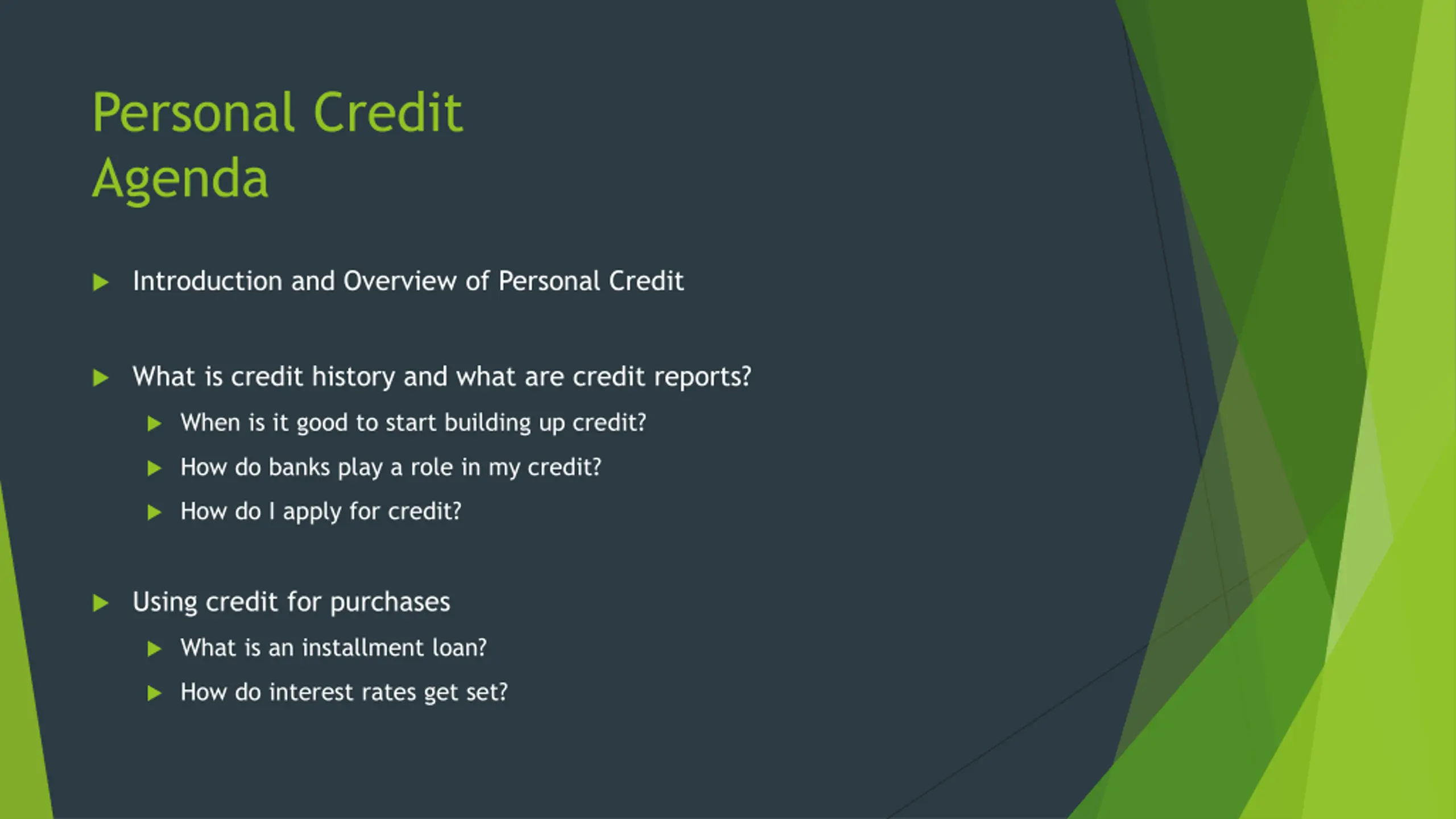 Personal Credit Agenda Introduction and Overview of Personal Credit What is credit history and what are credit reports? When is it good to start building up credit? How do banks play a role in my credit? How do I apply for credit? Using credit for purchases What is an installment loan? How do interest rates get set?