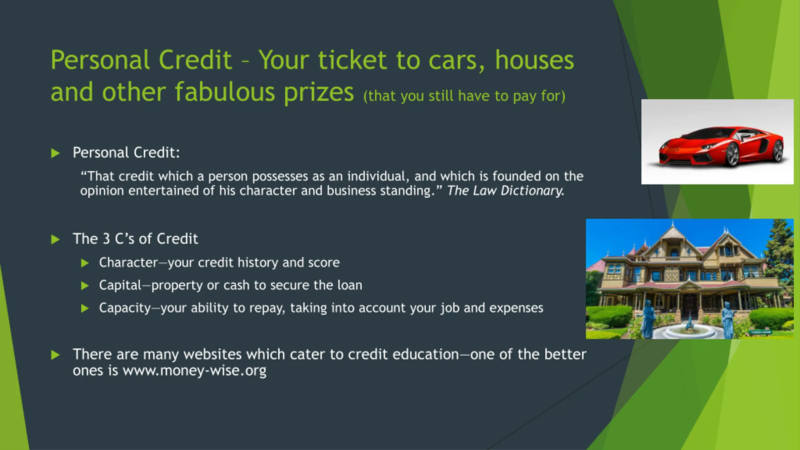 Personal Credit Your ticket to cars, houses and other fabulous prizes (that you still have to pay for) Personal Credit: That credit which a person possesses as an individual, and which is founded on the opinion entertained of his character and business standing. The Law Dictionary. The 3 C s of Credit Character your credit history and score Capital property or cash to secure the loan Capacity your ability to repay, taking into account your job and expenses There are many websites which cater to credit education one of the better ones is www.money-wise.org