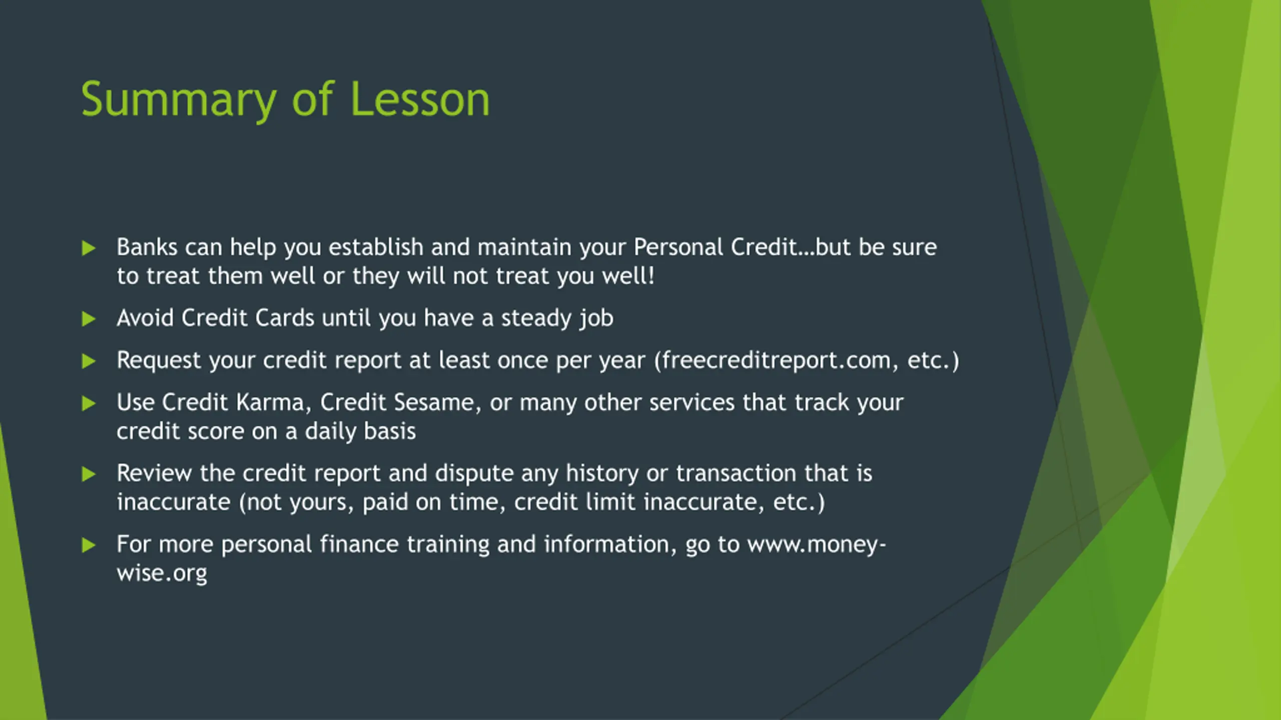 Summary of Lesson Banks can help you establish and maintain your Personal Credit but be sure to treat them well or they will not treat you well! Avoid Credit Cards until you have a steady job Request your credit report at least once per year (freecreditreport.com, etc.) Use Credit Karma, Credit Sesame, or many other services that track your credit score on a daily basis Review the credit report and dispute any history or transaction that is inaccurate (not yours, paid on time, credit limit inaccurate, etc.) For more personal finance training and information, go to www.money- wise.org