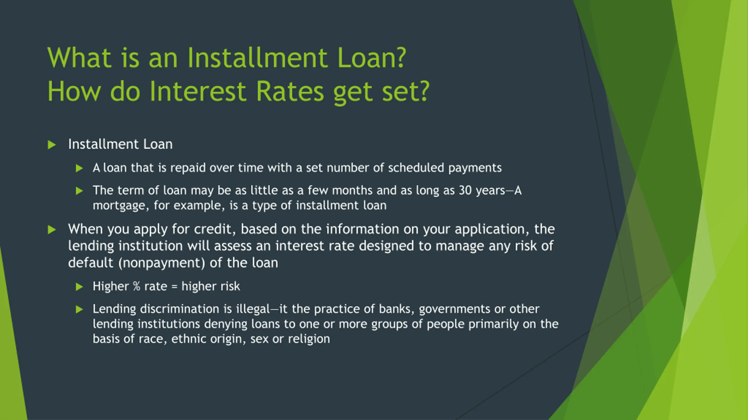 What is an Installment Loan? How do Interest Rates get set? Installment Loan A loan that is repaid over time with a set number of scheduled payments The term of loan may be as little as a few months and as long as 30 years A mortgage, for example, is a type of installment loan When you apply for credit, based on the information on your application, the lending institution will assess an interest rate designed to manage any risk of default (nonpayment) of the loan Higher % rate = higher risk Lending discrimination is illegal it the practice of banks, governments or other lending institutions denying loans to one or more groups of people primarily on the basis of race, ethnic origin, sex or religion