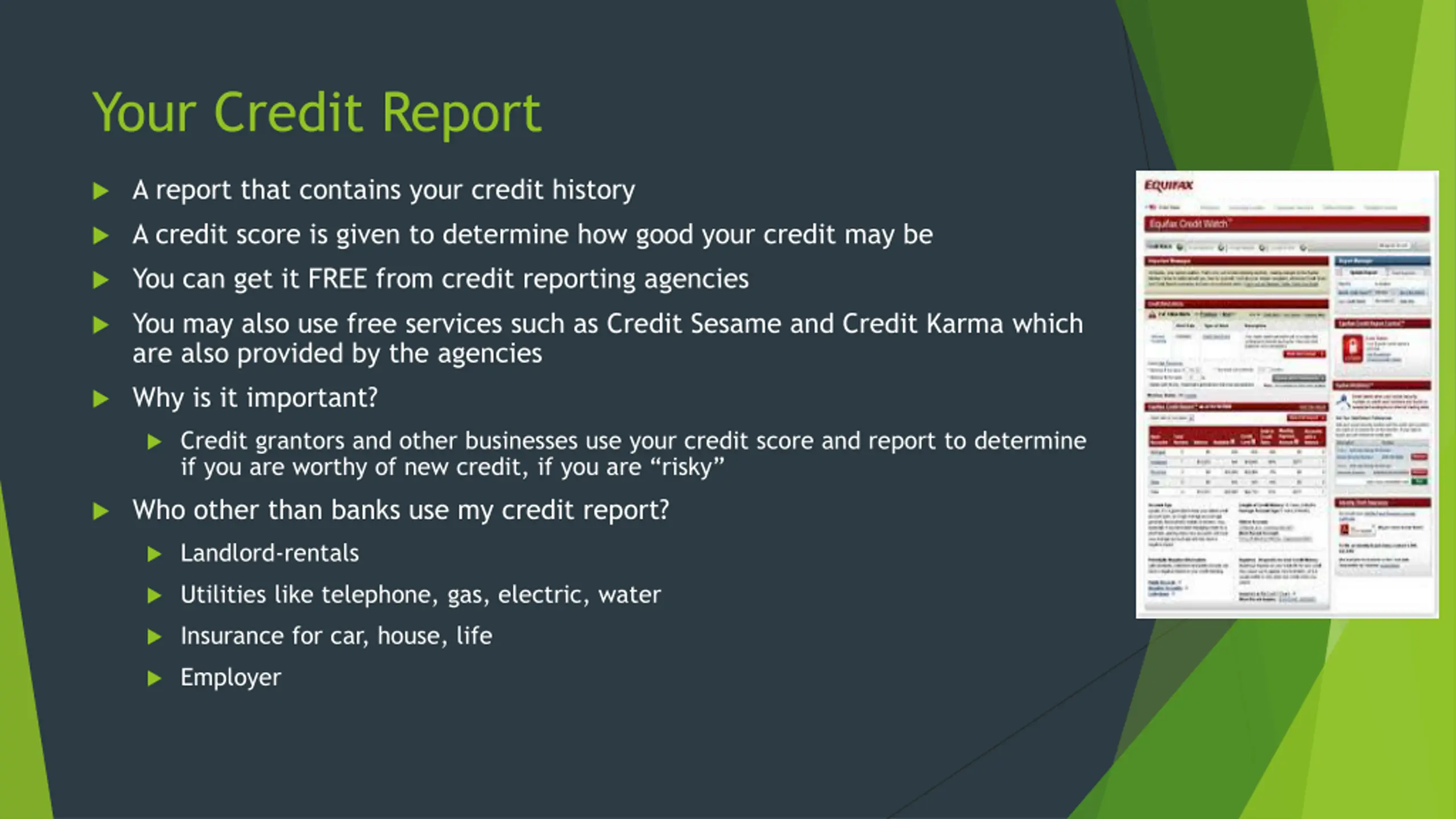 Your Credit Report A report that contains your credit history A credit score is given to determine how good your credit may be You can get it FREE from credit reporting agencies You may also use free services such as Credit Sesame and Credit Karma which are also provided by the agencies Why is it important? Credit grantors and other businesses use your credit score and report to determine if you are worthy of new credit, if you are risky Who other than banks use my credit report? Landlord-rentals Utilities like telephone, gas, electric, water Insurance for car, house, life Employer