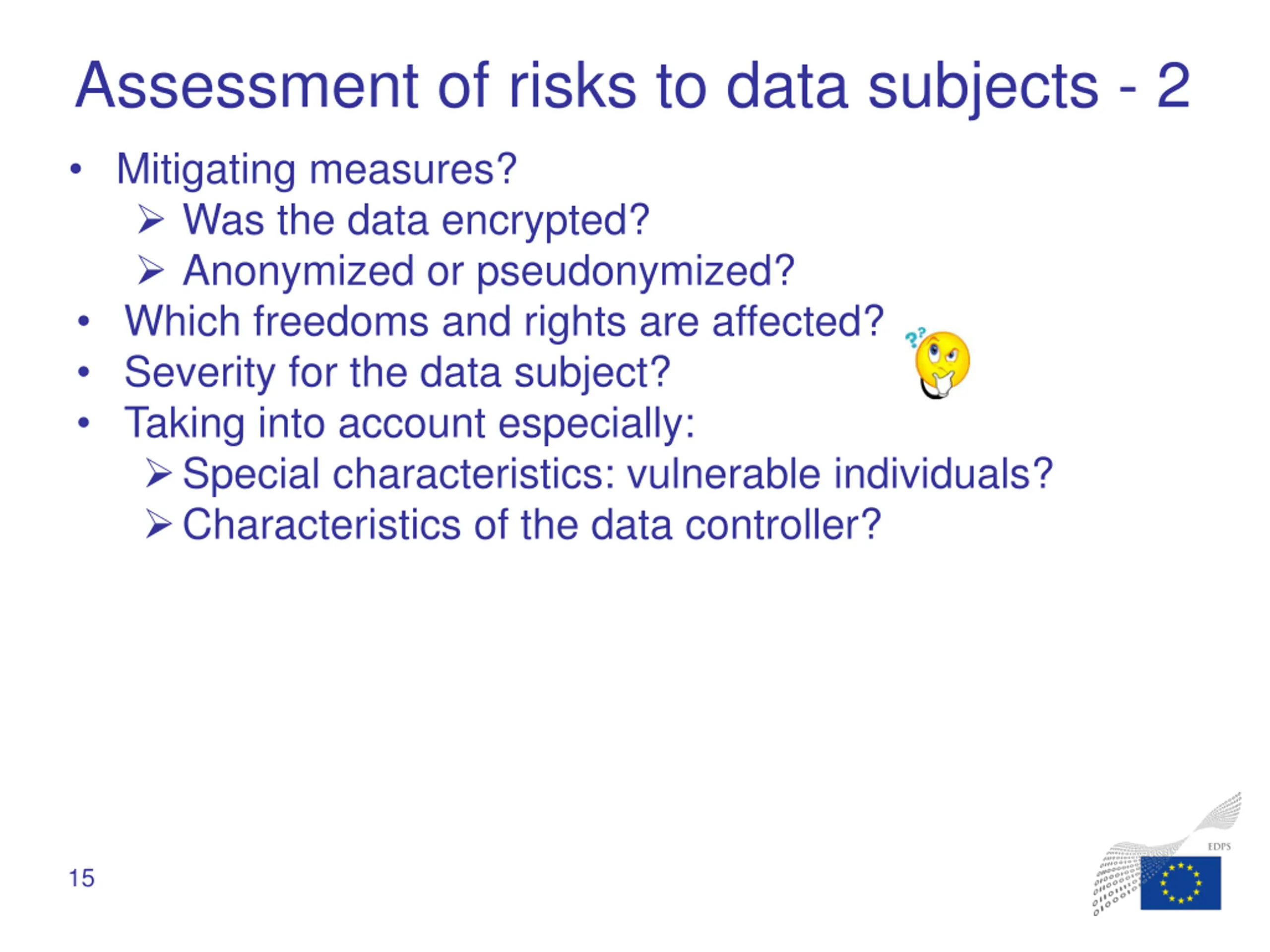 Assessment of risks to data subjects - 1 Risk: based on potential severity and likelihood What type of breach? What data? Personal data? Special categories of personal data? How many data subjects? How much data? Relation to other personal data? Chance of identification 14