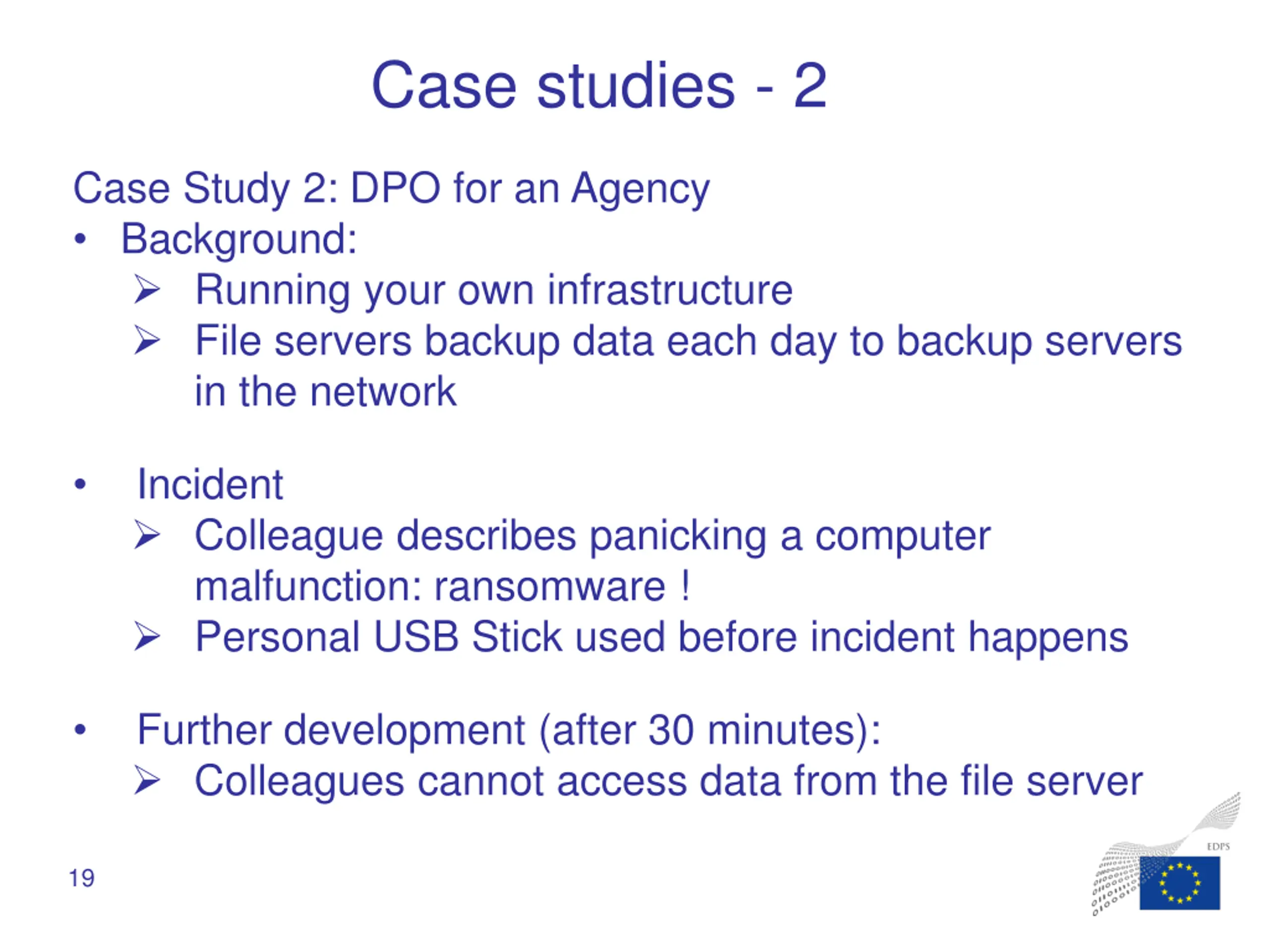 Case studies - 2 Case Study 2: DPO for an Agency Background: Running your own infrastructure File servers backup data each day to backup servers in the network Incident Colleague describes panicking a computer malfunction: ransomware ! Personal USB Stick used before incident happens Further development (after 30 minutes): Colleagues cannot access data from the file server 19