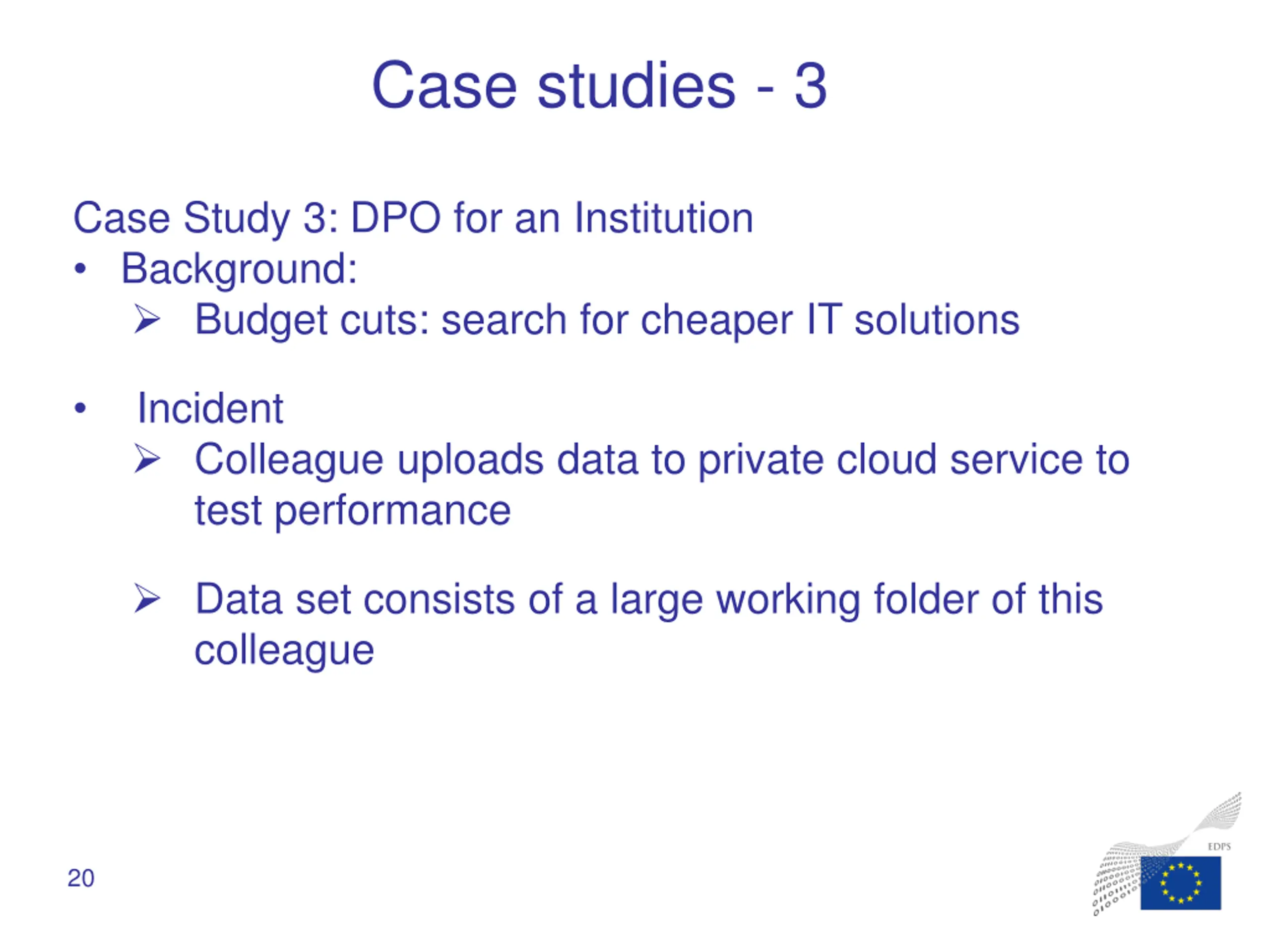 Case studies - 3 Case Study 3: DPO for an Institution Background: Budget cuts: search for cheaper IT solutions Incident Colleague uploads data to private cloud service to test performance Data set consists of a large working folder of this colleague 20