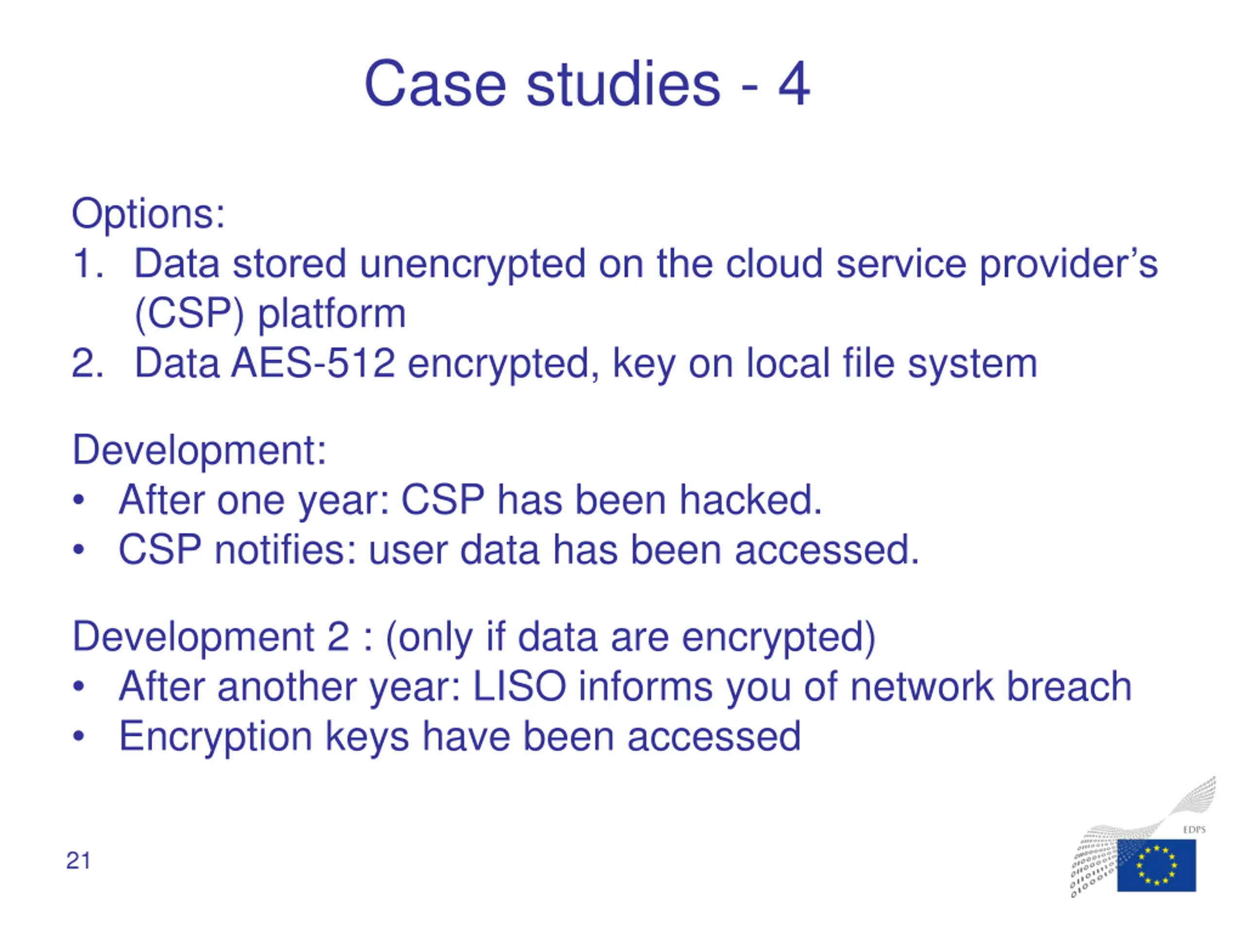 Case studies - 4 Options: 1. Data stored unencrypted on the cloud service provider s (CSP) platform 2. Data AES-512 encrypted, key on local file system Development: After one year: CSP has been hacked. CSP notifies: user data has been accessed. Development 2 : (only if data are encrypted) After another year: LISO informs you of network breach Encryption keys have been accessed 21