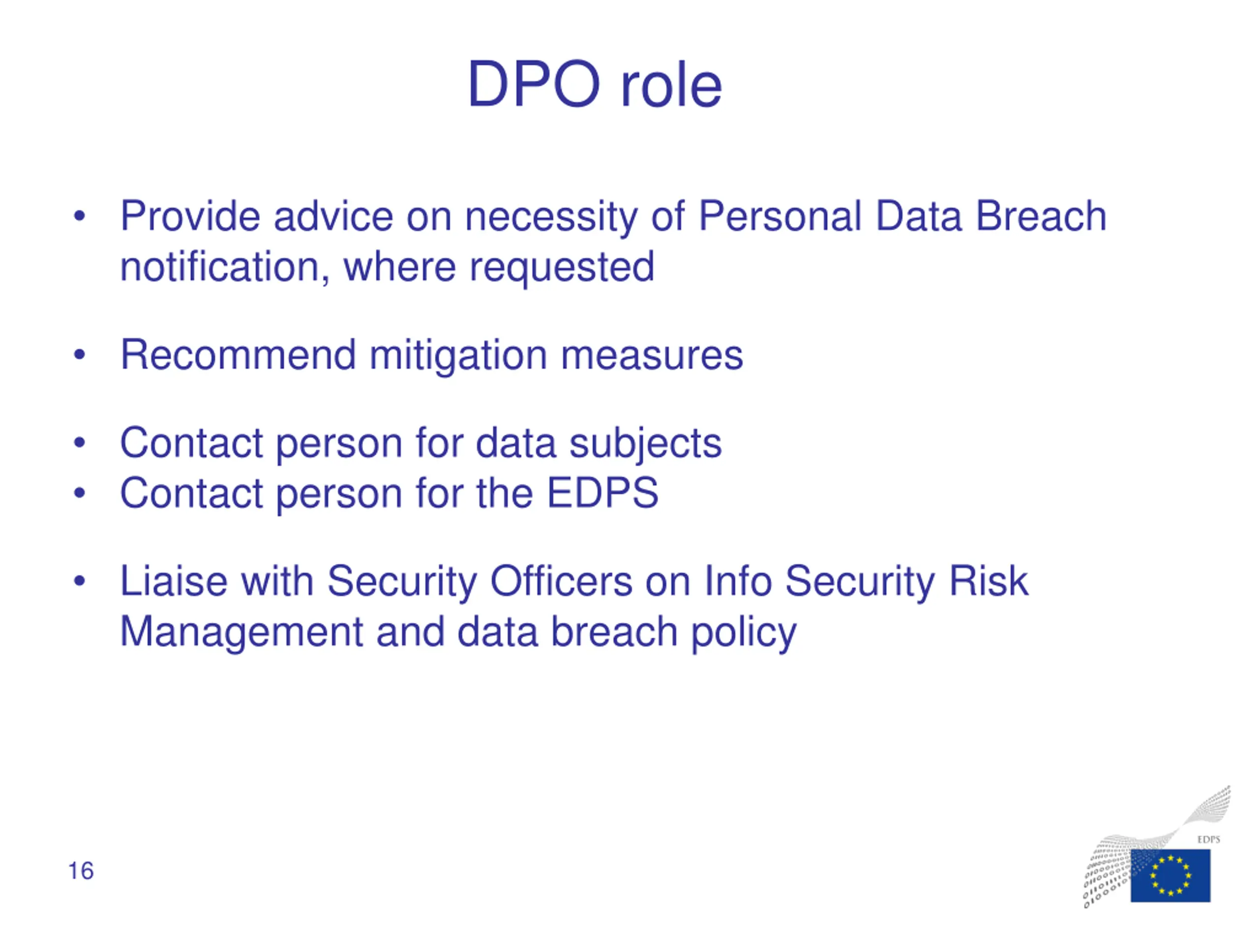 DPO role Provide advice on necessity of Personal Data Breach notification, where requested Recommend mitigation measures Contact person for data subjects Contact person for the EDPS Liaise with Security Officers on Info Security Risk Management and data breach policy 16