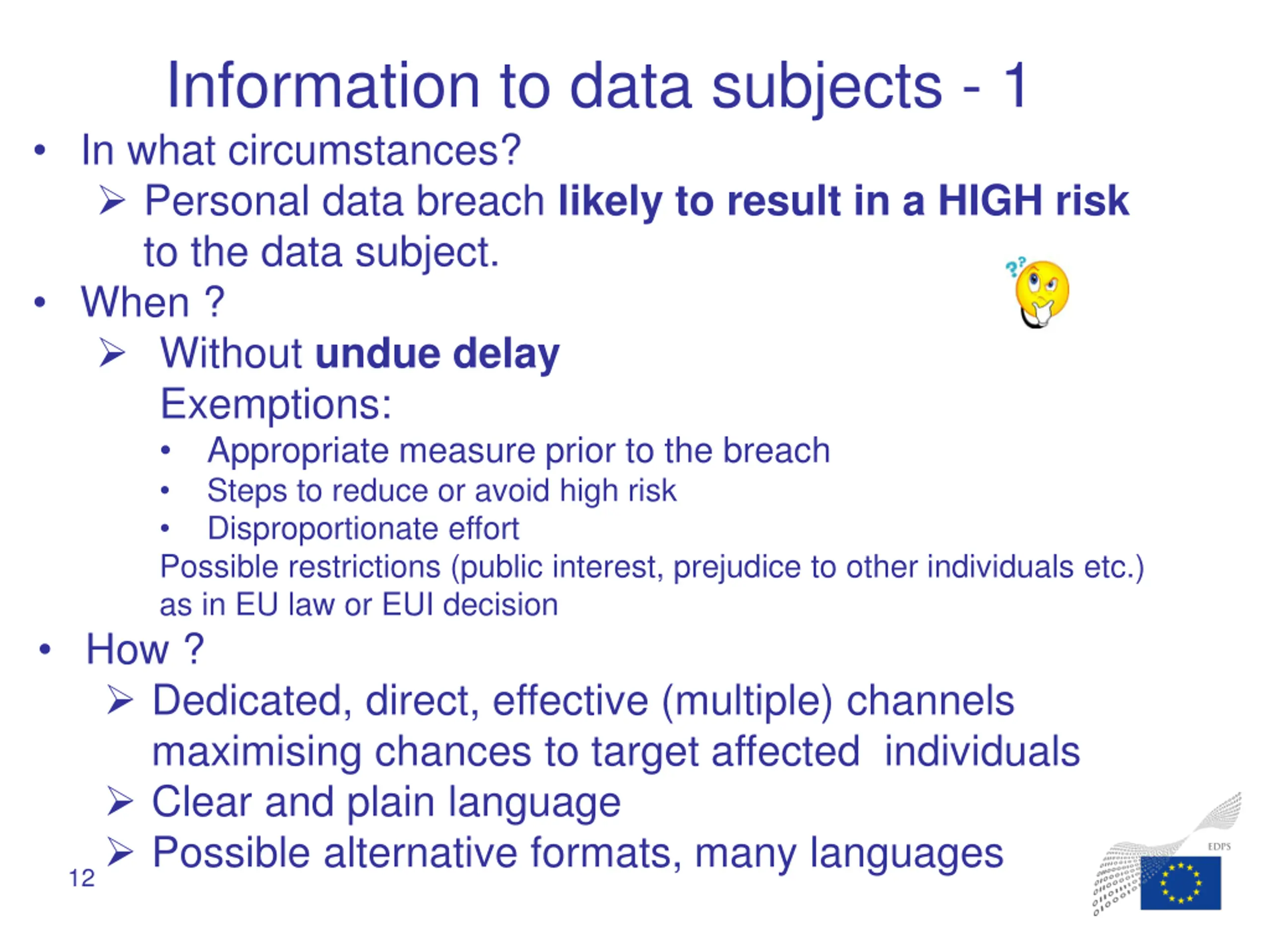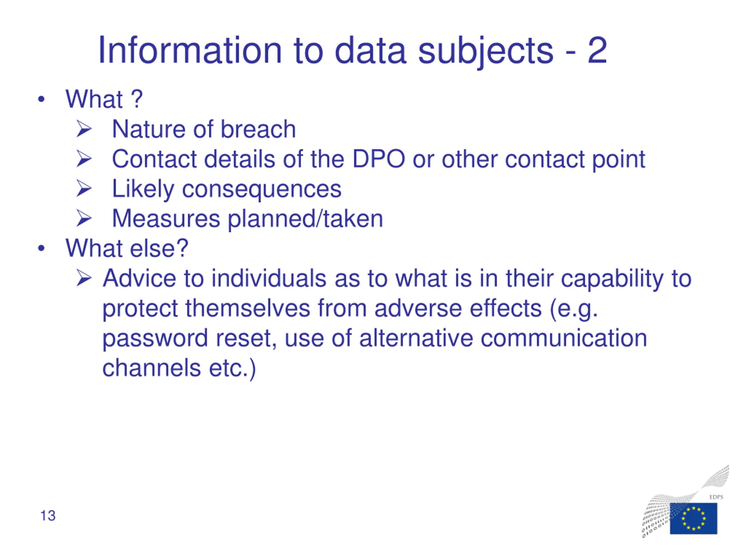 Information to data subjects - 1 In what circumstances? Personal data breach likely to result in a HIGH risk to the data subject. When ? Without undue delay Exemptions: Appropriate measure prior to the breach Steps to reduce or avoid high risk Disproportionate effort Possible restrictions (public interest, prejudice to other individuals etc.) as in EU law or EUI decision How ? Dedicated, direct, effective (multiple) channels maximising chances to target affected individuals Clear and plain language Possible alternative formats, many languages 12