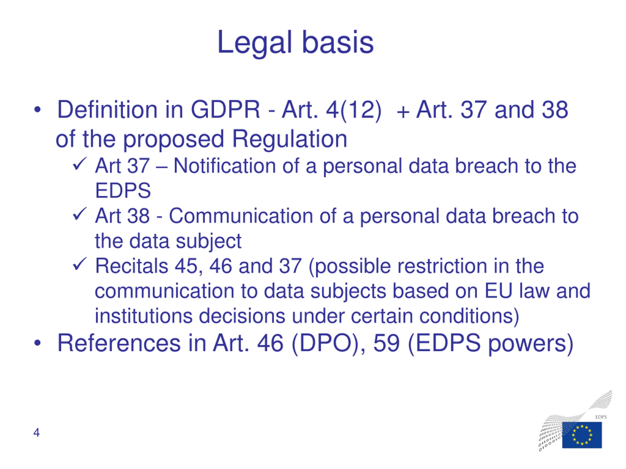 Legal basis Definition in GDPR - Art. 4(12) + Art. 37 and 38 of the proposed Regulation Art 37 Notification of a personal data breach to the EDPS Art 38 - Communication of a personal data breach to the data subject Recitals 45, 46 and 37 (possible restriction in the communication to data subjects based on EU law and institutions decisions under certain conditions) References in Art. 46 (DPO), 59 (EDPS powers) 4