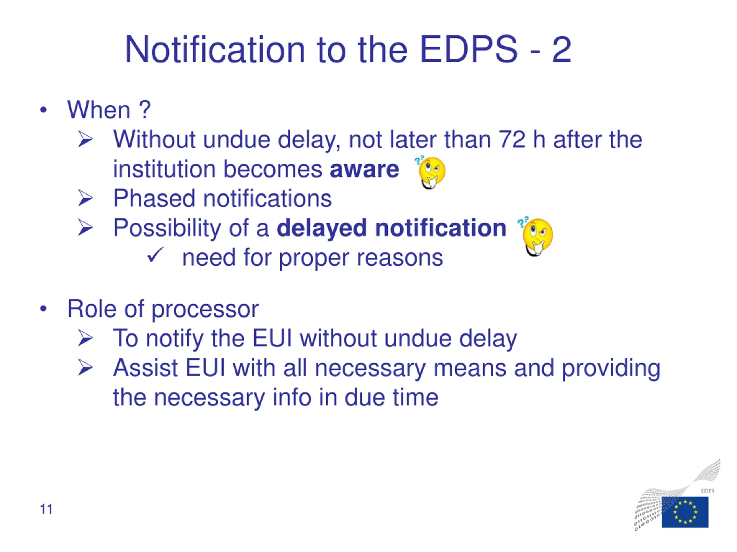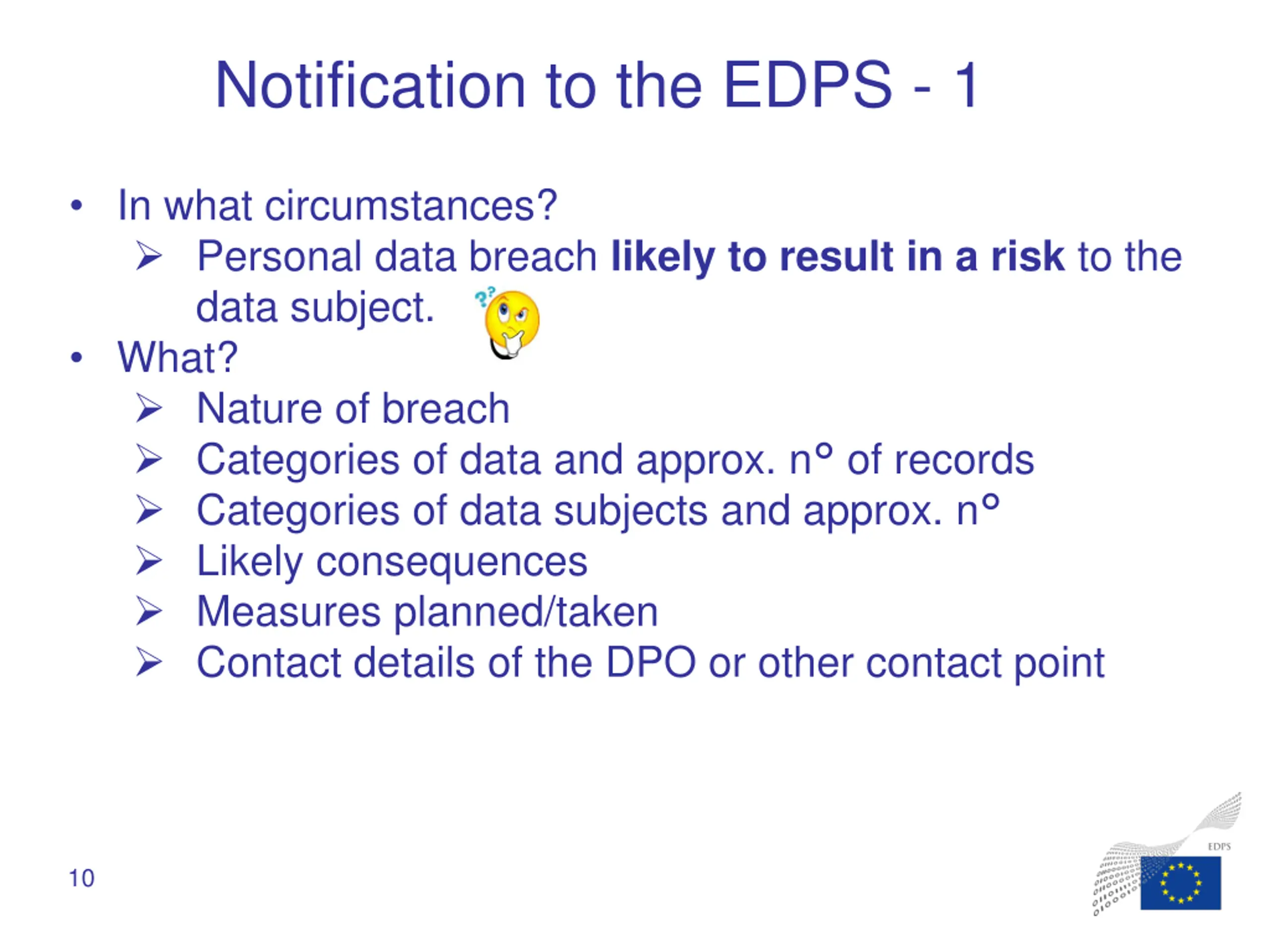 Notification to the EDPS - 1 In what circumstances? Personal data breach likely to result in a risk to the data subject. What? Nature of breach Categories of data and approx. n of records Categories of data subjects and approx. n Likely consequences Measures planned/taken Contact details of the DPO or other contact point 10