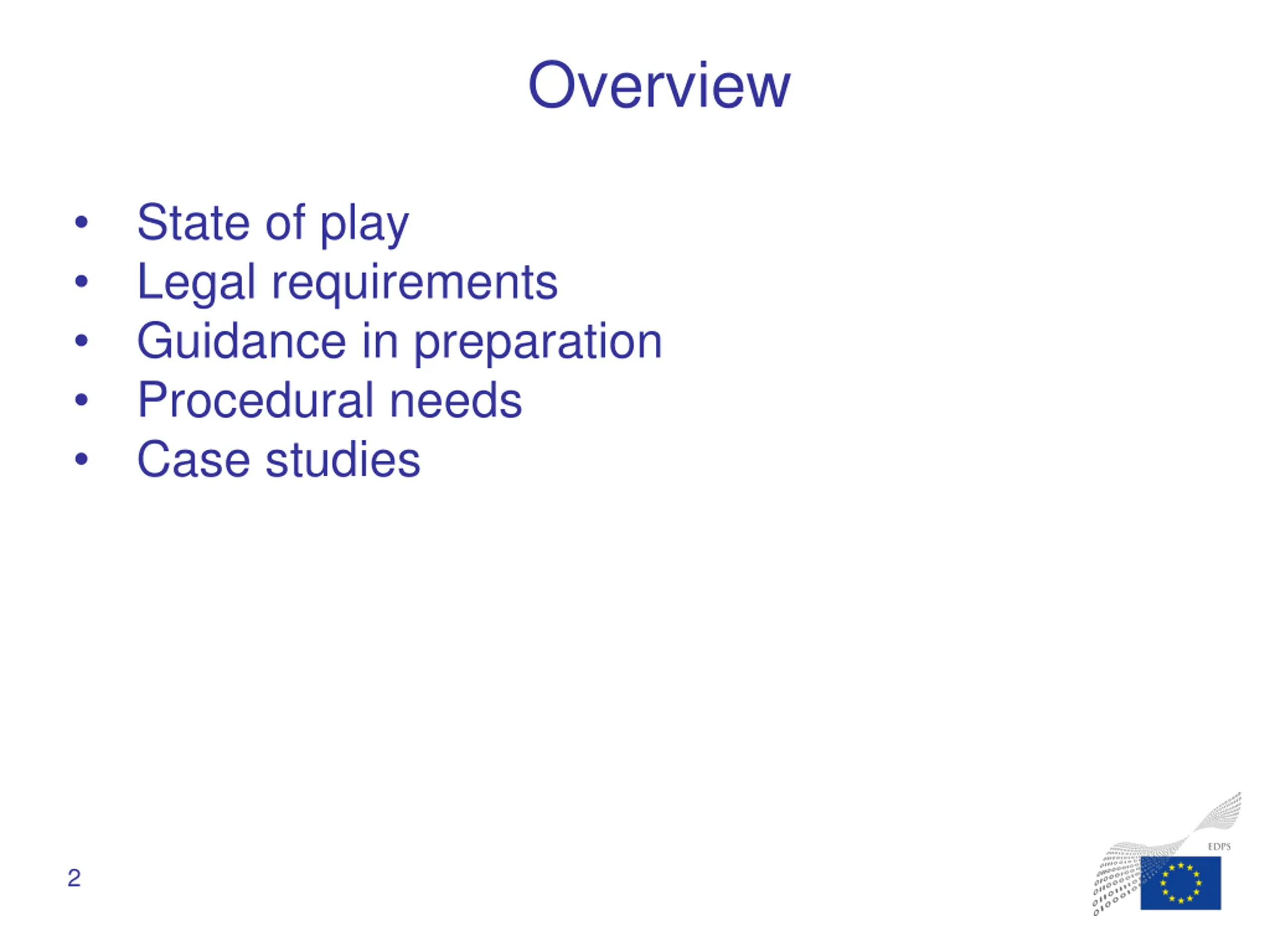 Overview State of play Legal requirements Guidance in preparation Procedural needs Case studies 2