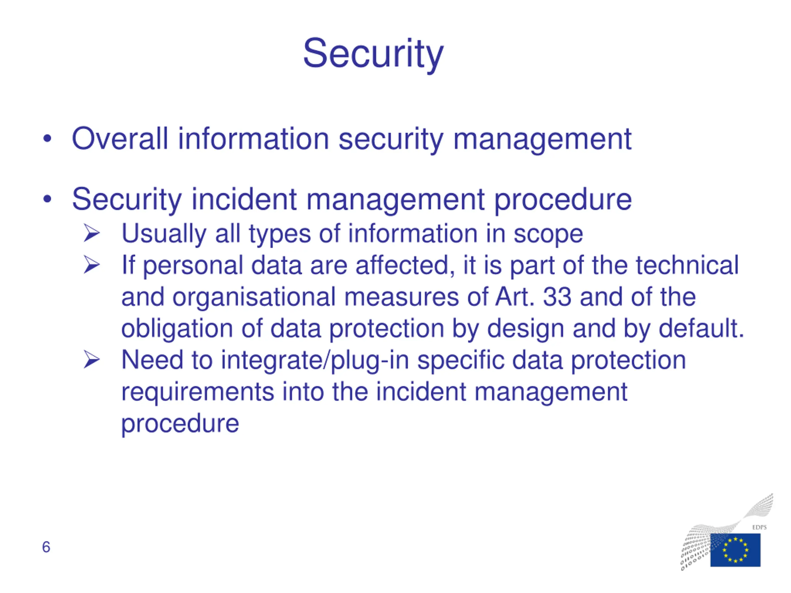 Security Overall information security management Security incident management procedure Usually all types of information in scope If personal data are affected, it is part of the technical and organisational measures of Art. 33 and of the obligation of data protection by design and by default. Need to integrate/plug-in specific data protection requirements into the incident management procedure 6