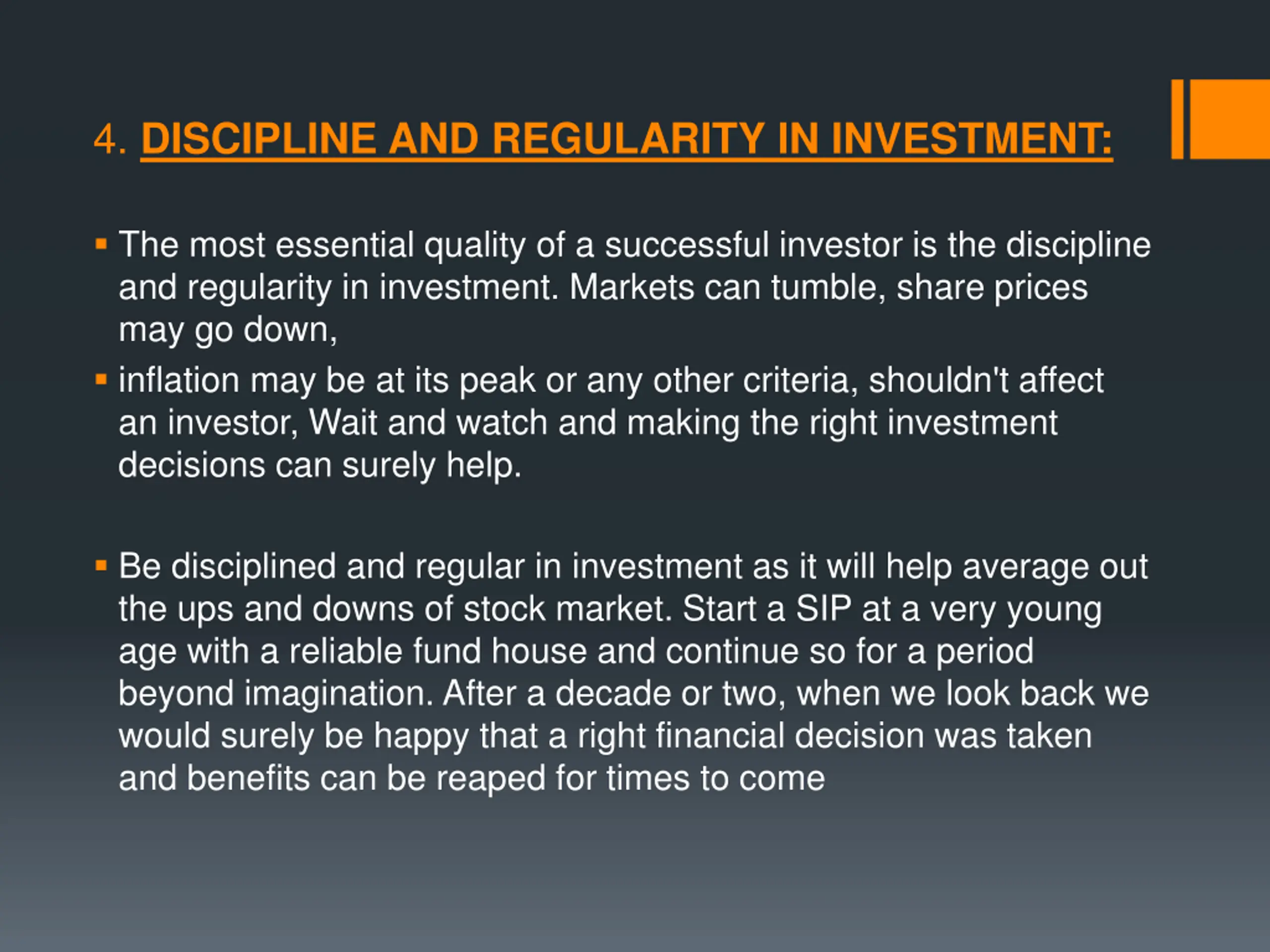 4. DISCIPLINE AND REGULARITY IN INVESTMENT: The most essential quality of a successful investor is the discipline and regularity in investment. Markets can tumble, share prices may go down, inflation may be at its peak or any other criteria, shouldn't affect an investor, Wait and watch and making the right investment decisions can surely help. Be disciplined and regular in investment as it will help average out the ups and downs of stock market. Start a SIP at a very young age with a reliable fund house and continue so for a period beyond imagination. After a decade or two, when we look back we would surely be happy that a right financial decision was taken and benefits can be reaped for times to come