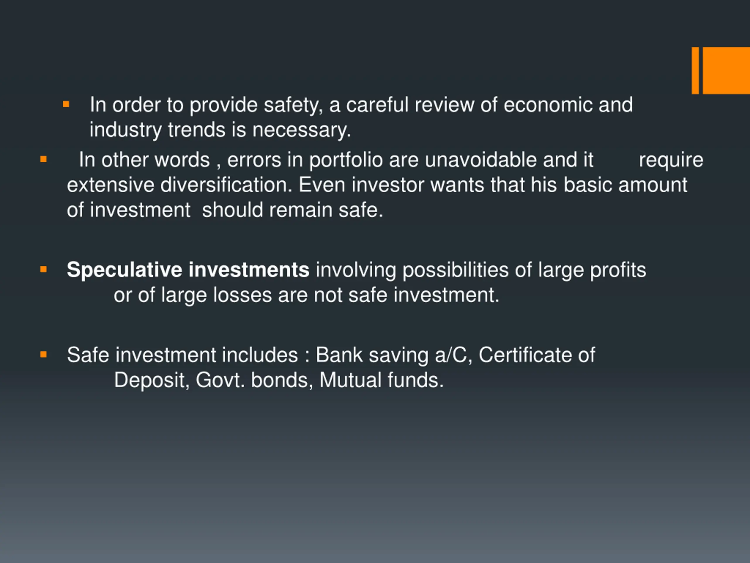 In order to provide safety, a careful review of economic and industry trends is necessary. In other words , errors in portfolio are unavoidable and it extensive diversification. Even investor wants that his basic amount of investment should remain safe. require Speculative investments involving possibilities of large profits or of large losses are not safe investment. Safe investment includes : Bank saving a/C, Certificate of Deposit, Govt. bonds, Mutual funds.
