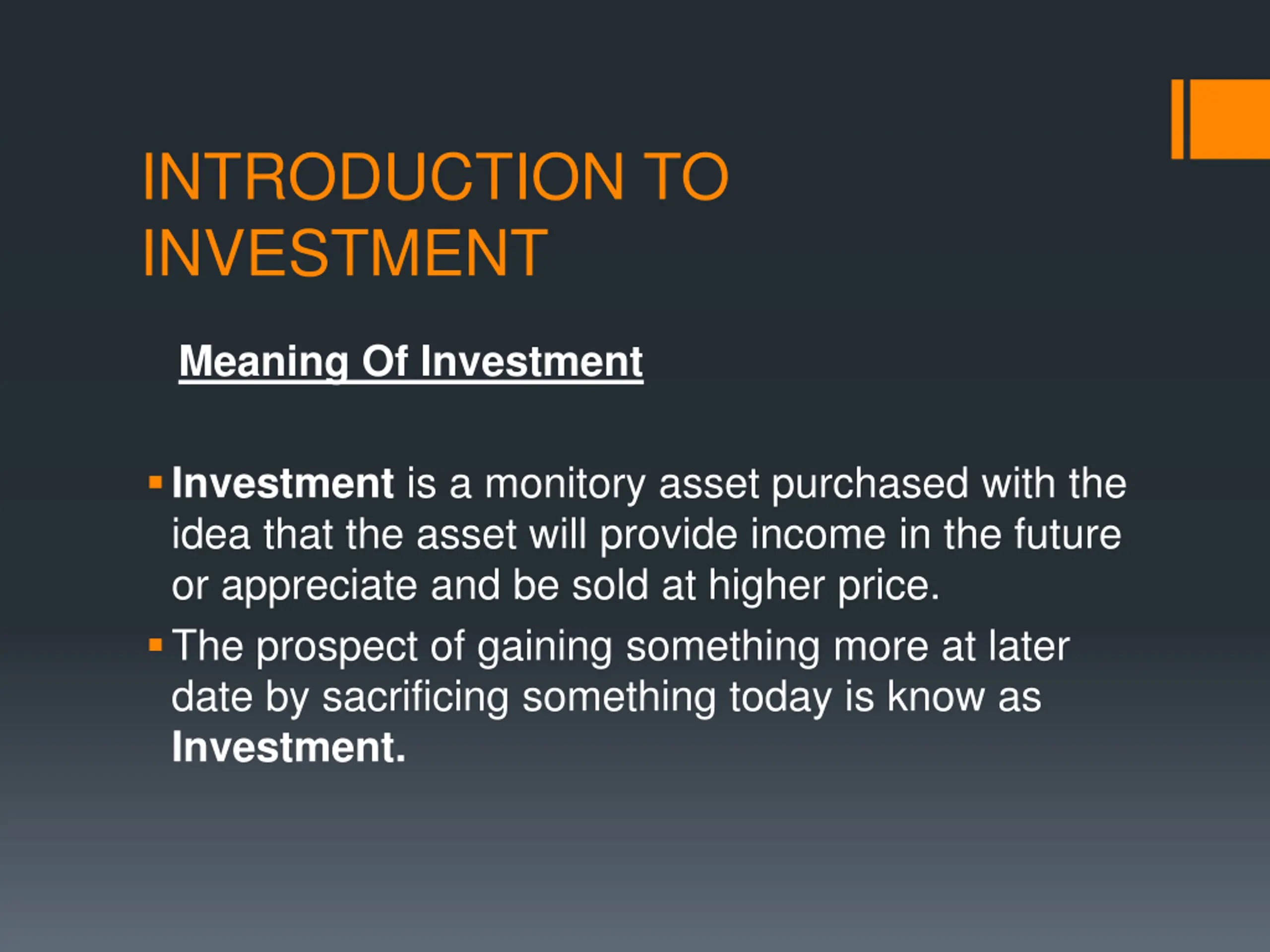 INTRODUCTION TO INVESTMENT Meaning Of Investment Investment is a monitory asset purchased with the idea that the asset will provide income in the future or appreciate and be sold at higher price. The prospect of gaining something more at later date by sacrificing something today is know as Investment.