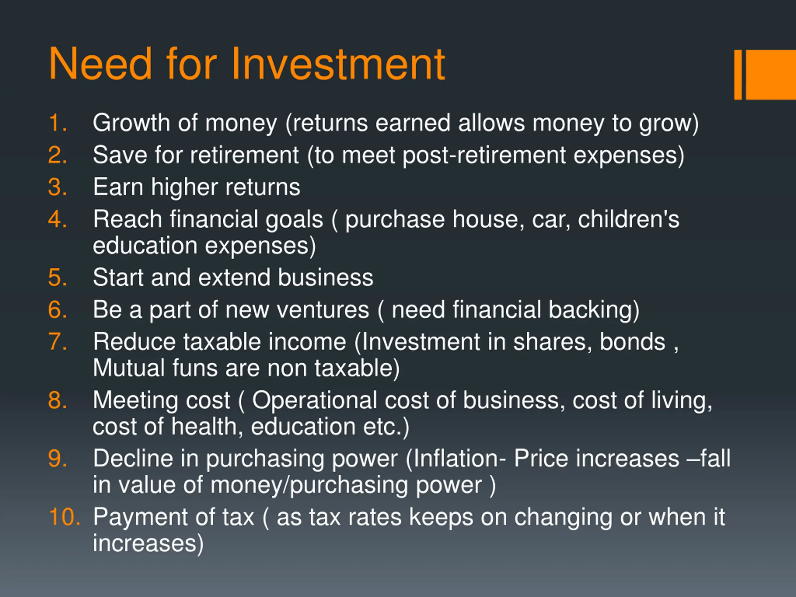 Need for Investment 1. 2. 3. 4. Growth of money (returns earned allows money to grow) Save for retirement (to meet post-retirement expenses) Earn higher returns Reach financial goals ( purchase house, car, children's education expenses) Start and extend business Be a part of new ventures ( need financial backing) Reduce taxable income (Investment in shares, bonds , Mutual funs are non taxable) Meeting cost ( Operational cost of business, cost of living, cost of health, education etc.) Decline in purchasing power (Inflation- Price increases fall in value of money/purchasing power ) 10. Payment of tax ( as tax rates keeps on changing or when it increases) 5. 6. 7. 8. 9.