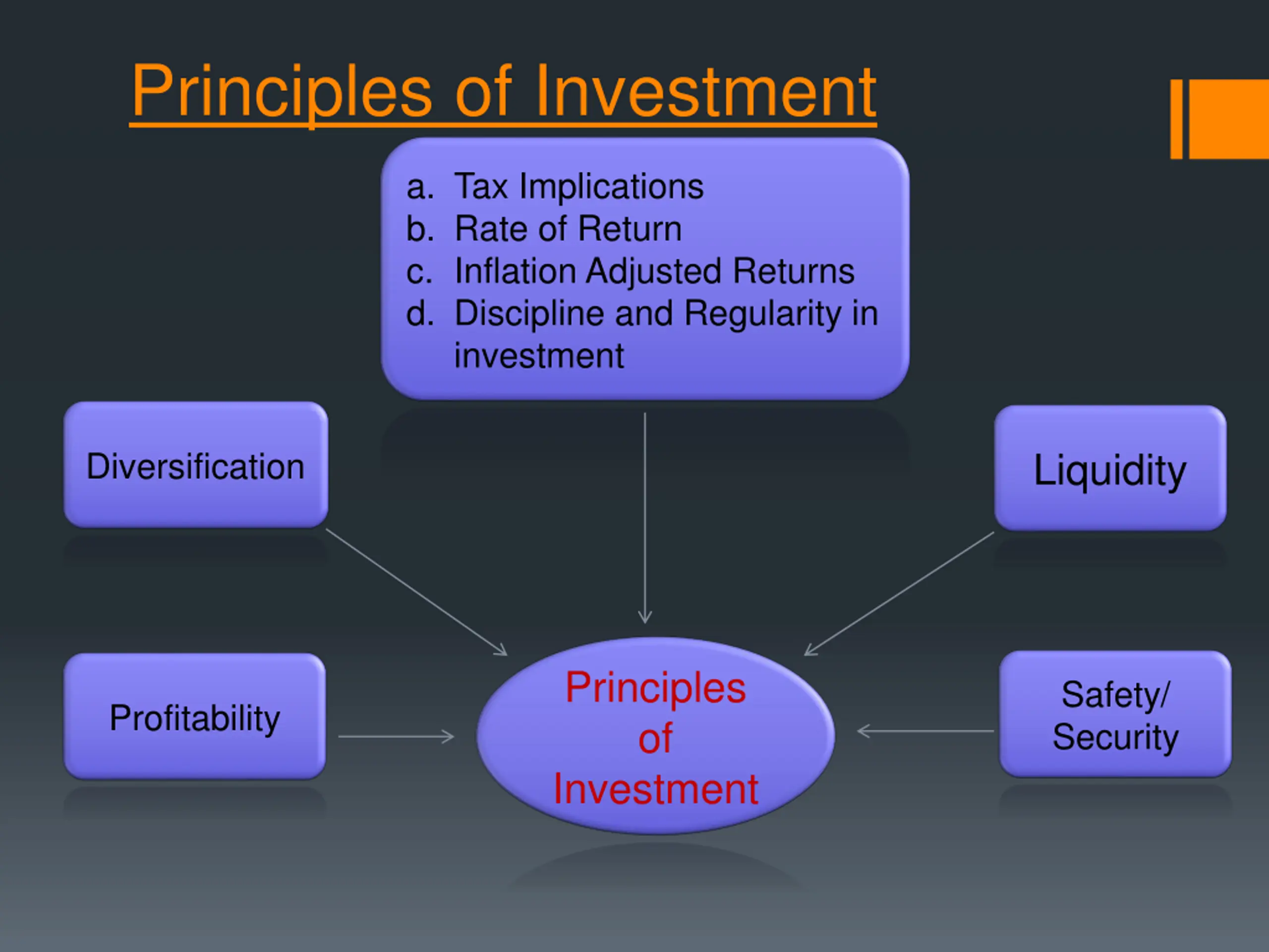 Principles of Investment a. Tax Implications b. Rate of Return c. Inflation Adjusted Returns d. Discipline and Regularity in investment Liquidity Diversification Principles of Investment Safety/ Security Profitability