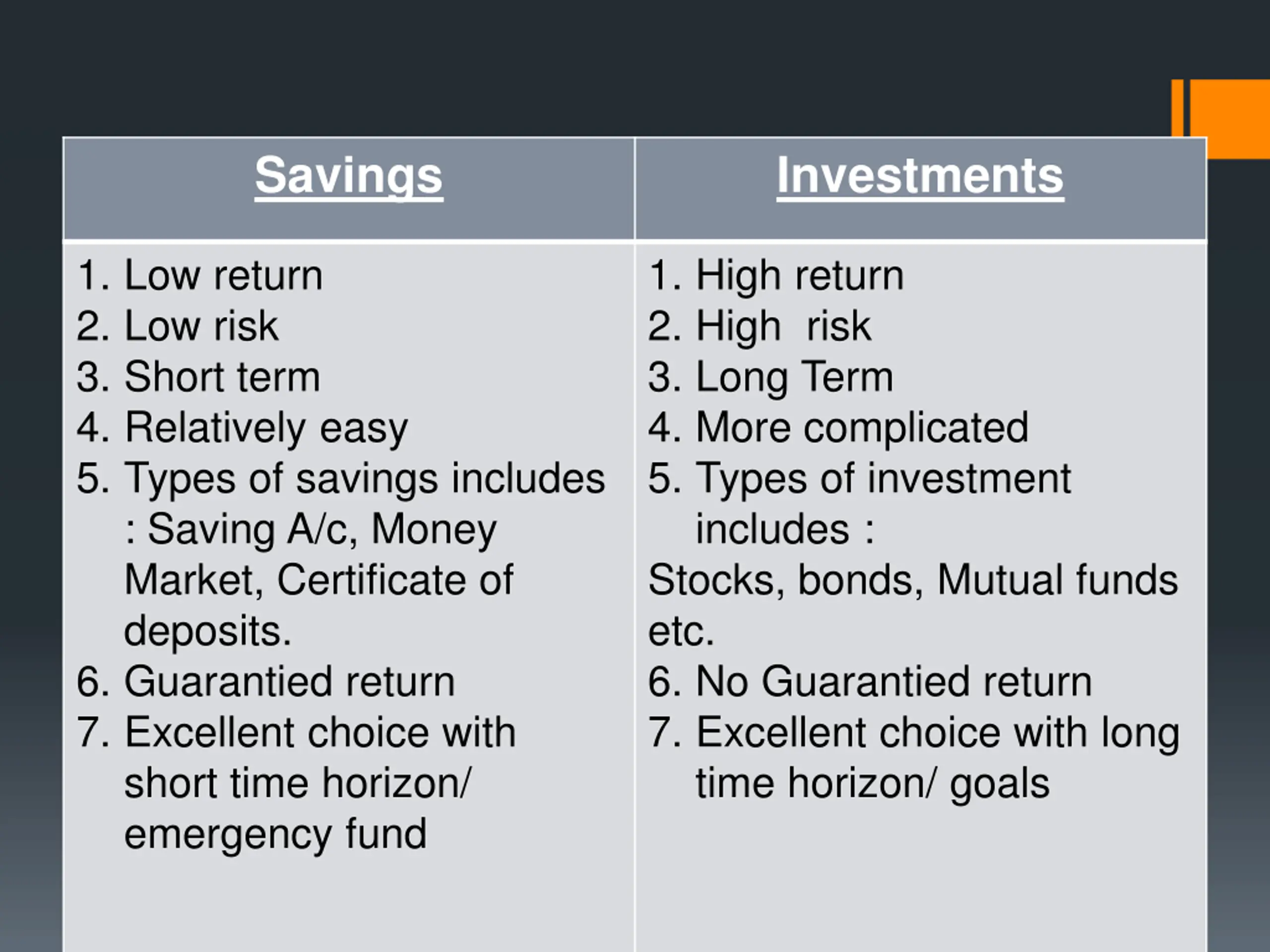 Savings Investments Savings V/s Investment 1. Low return 2. Low risk 3. Short term 4. Relatively easy 5. Types of savings includes : Saving A/c, Money Market, Certificate of deposits. 6. Guarantied return 7. Excellent choice with short time horizon/ emergency fund 1. High return 2. High risk 3. Long Term 4. More complicated 5. Types of investment includes : Stocks, bonds, Mutual funds etc. 6. No Guarantied return 7. Excellent choice with long time horizon/ goals
