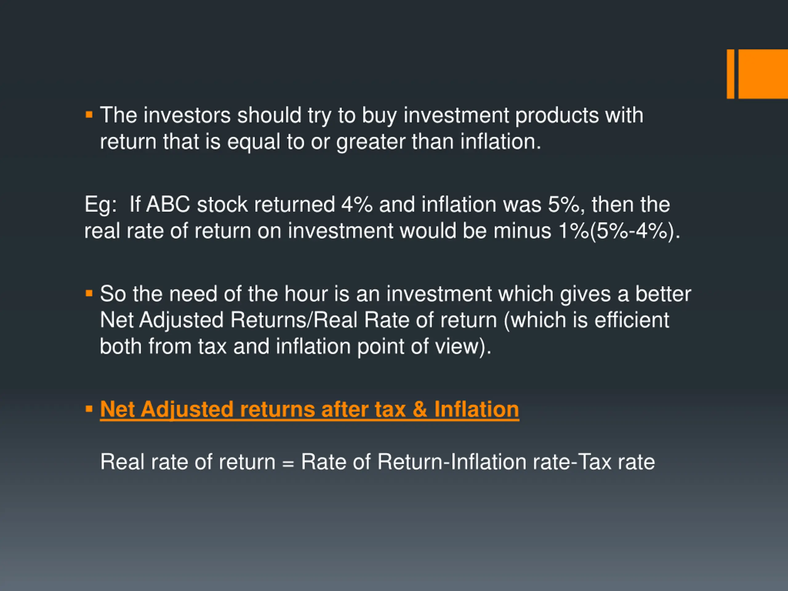 The investors should try to buy investment products with return that is equal to or greater than inflation. Eg: If ABC stock returned 4% and inflation was 5%, then the real rate of return on investment would be minus 1%(5%-4%). So the need of the hour is an investment which gives a better Net Adjusted Returns/Real Rate of return (which is efficient both from tax and inflation point of view). Net Adjusted returns after tax & Inflation Real rate of return = Rate of Return-Inflation rate-Tax rate