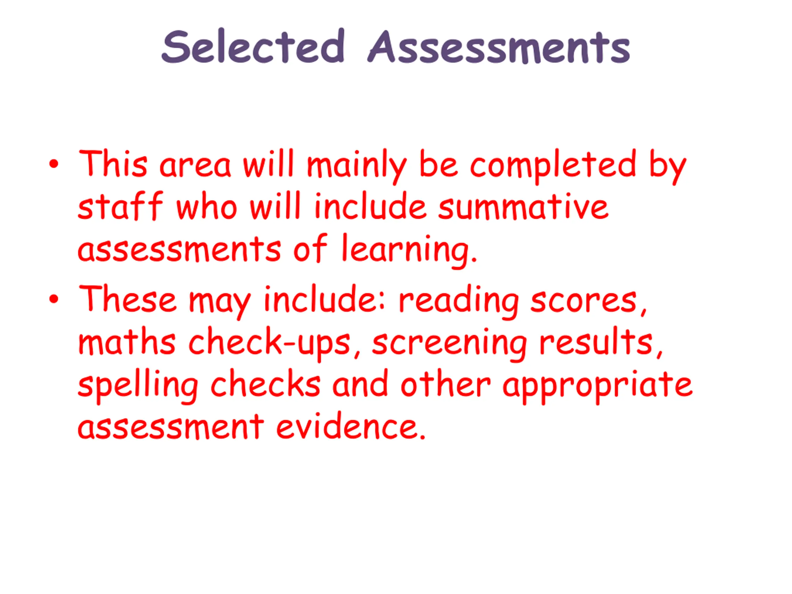Selected Assessments This area will mainly be completed by staff who will include summative assessments of learning. These may include: reading scores, maths check-ups, screening results, spelling checks and other appropriate assessment evidence.