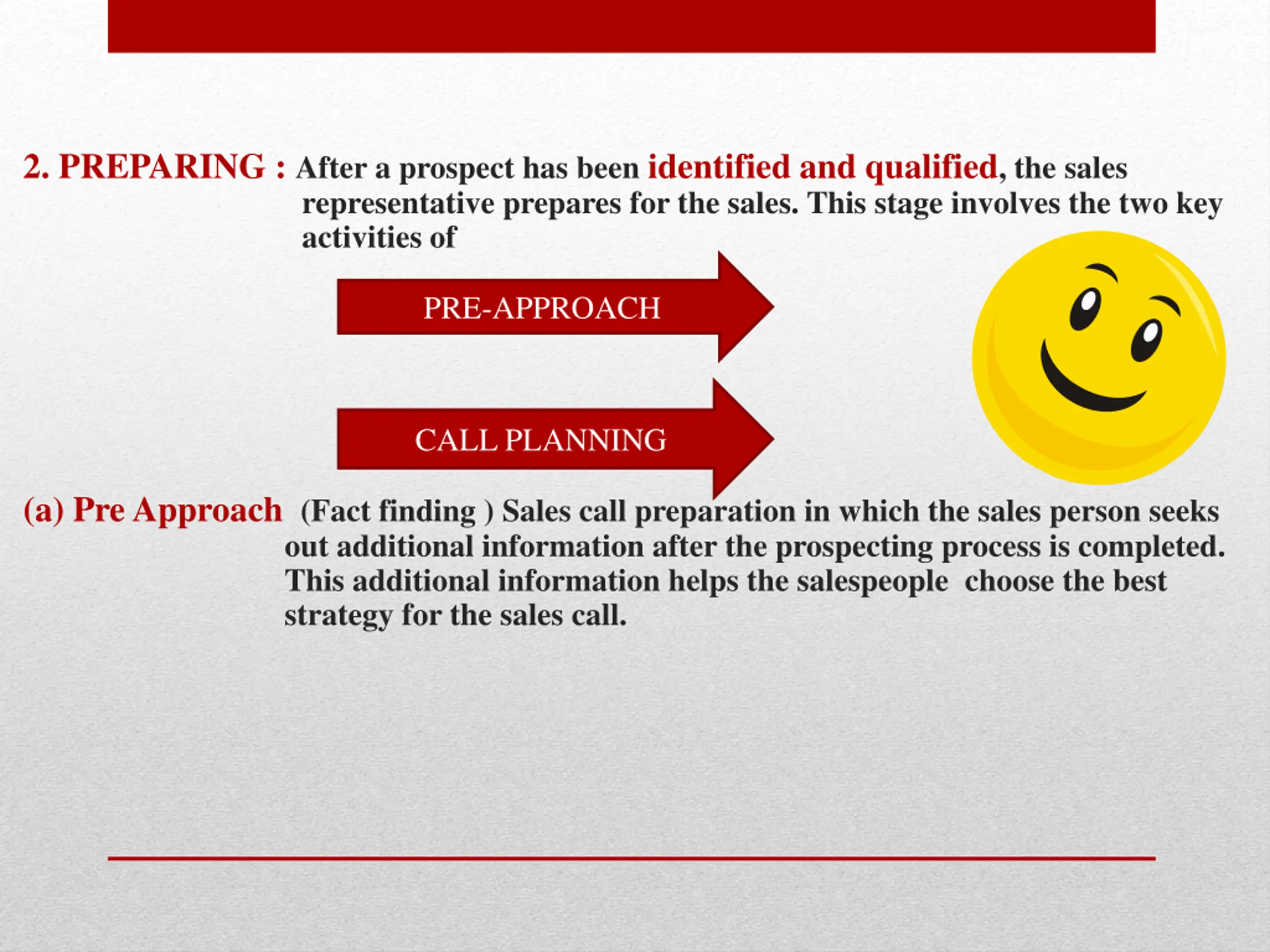 2. PREPARING : After a prospect has been identified and qualified, the sales representative prepares for the sales. This stage involves the two key activities of PRE-APPROACH CALL PLANNING (a) Pre Approach (Fact finding ) Sales call preparation in which the sales person seeks out additional information after the prospecting process is completed. This additional information helps the salespeople choose the best strategy for the sales call.