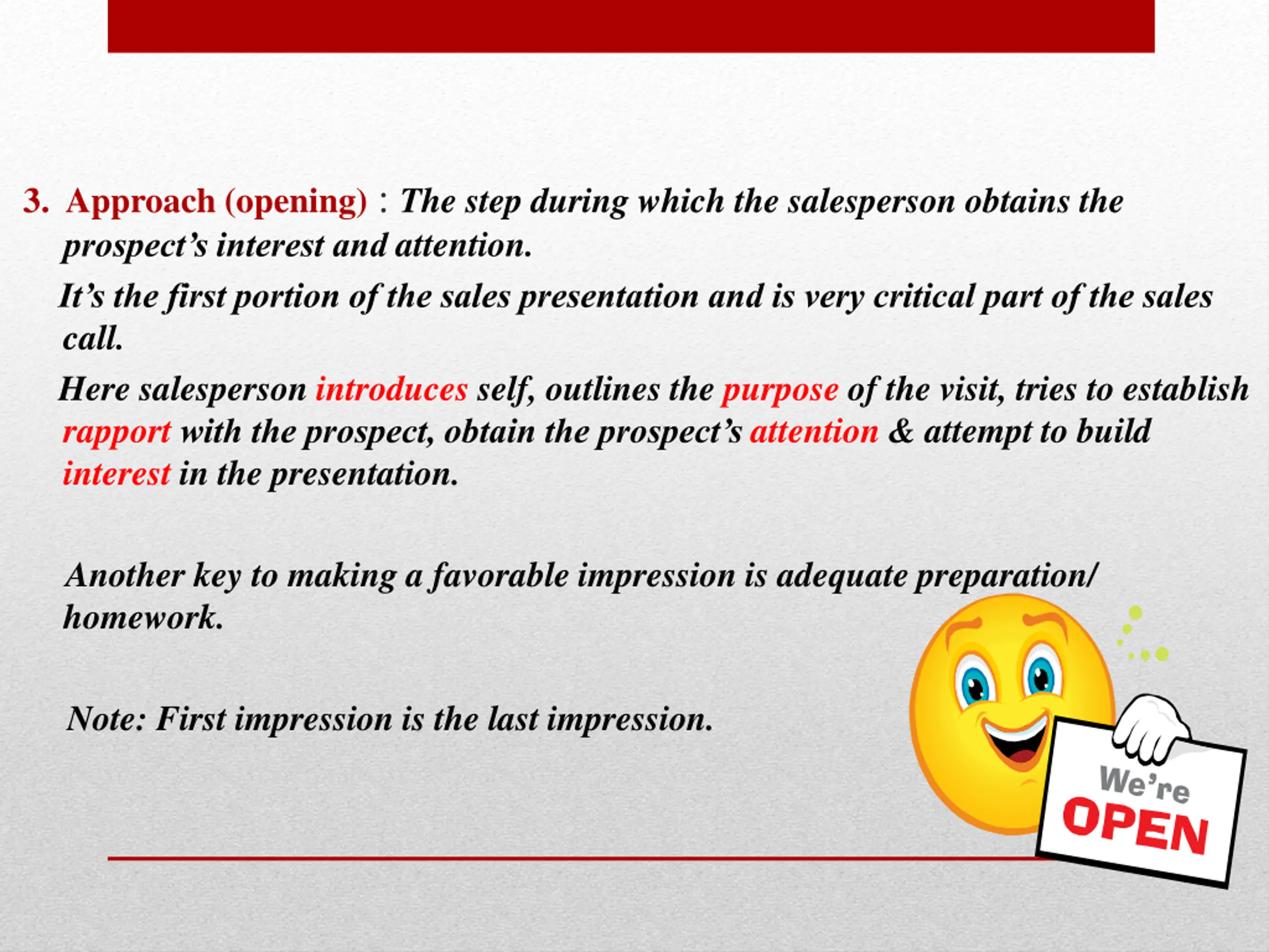 3. Approach (opening) : The step during which the salesperson obtains the prospect s interest and attention. It s the first portion of the sales presentation and is very critical part of the sales call. Here salesperson introduces self, outlines the purpose of the visit, tries to establish rapport with the prospect, obtain the prospect s attention & attempt to build interest in the presentation. Another key to making a favorable impression is adequate preparation/ homework. Note: First impression is the last impression.