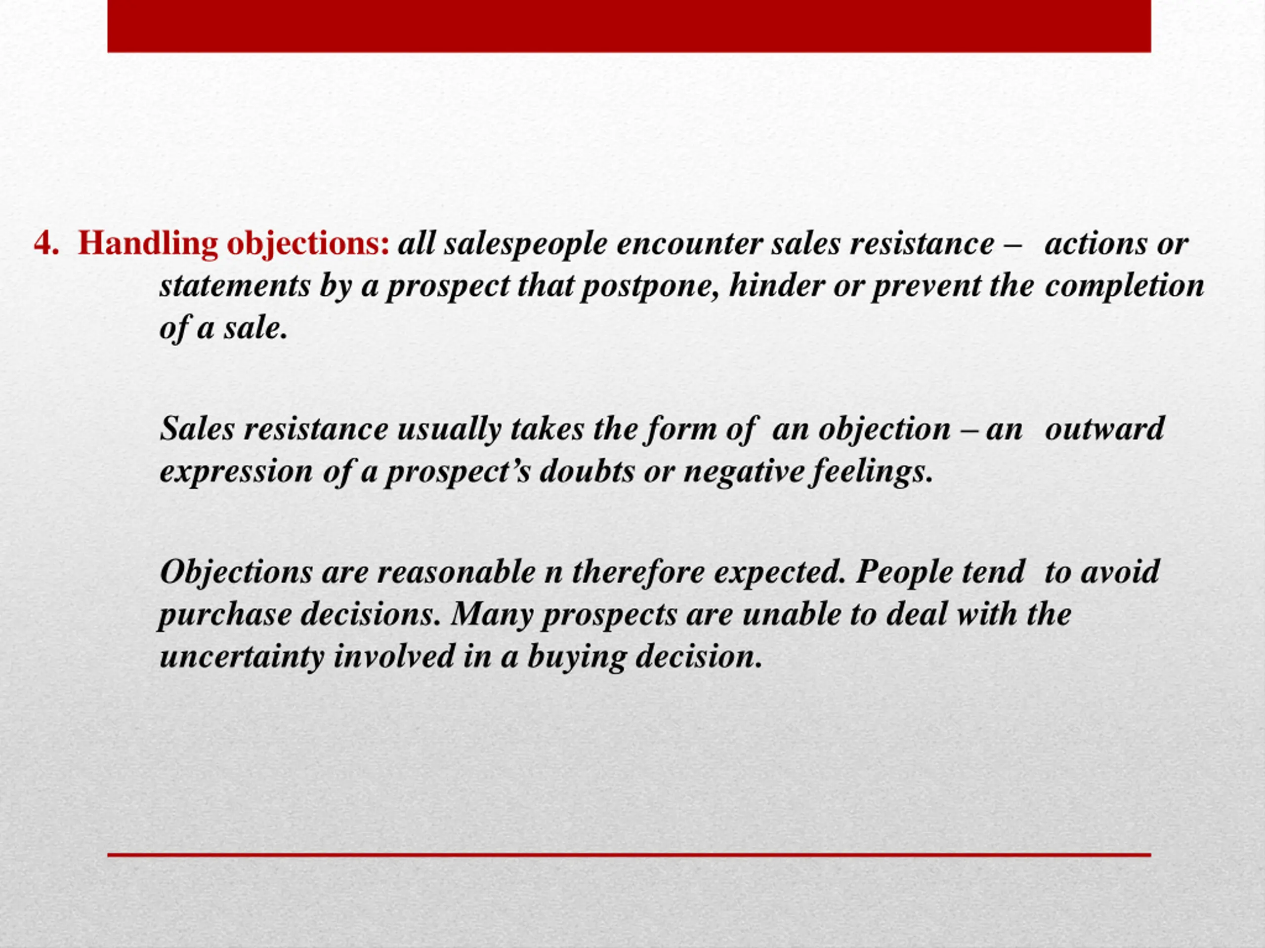 4. Handling objections: all salespeople encounter sales resistance actions or statements by a prospect that postpone, hinder or prevent the completion of a sale. Sales resistance usually takes the form of an objection an outward expression of a prospect s doubts or negative feelings. Objections are reasonable n therefore expected. People tend to avoid purchase decisions. Many prospects are unable to deal with the uncertainty involved in a buying decision.