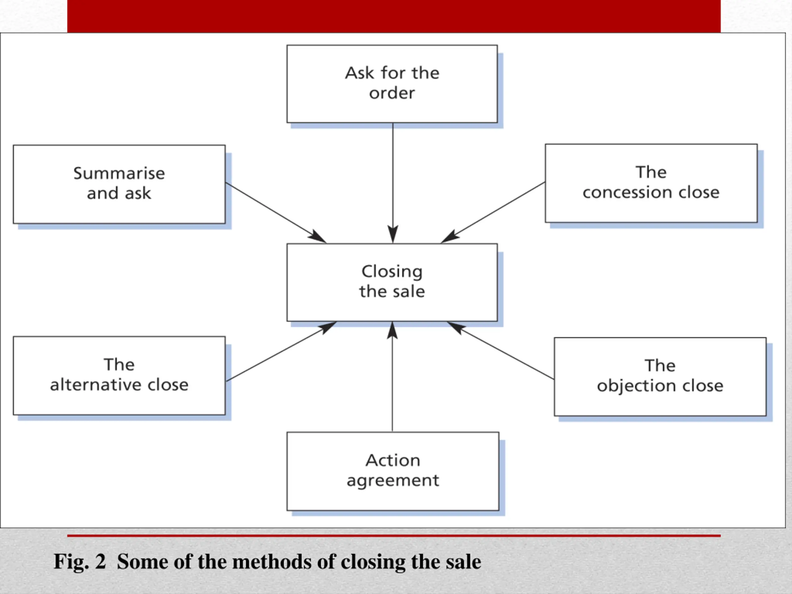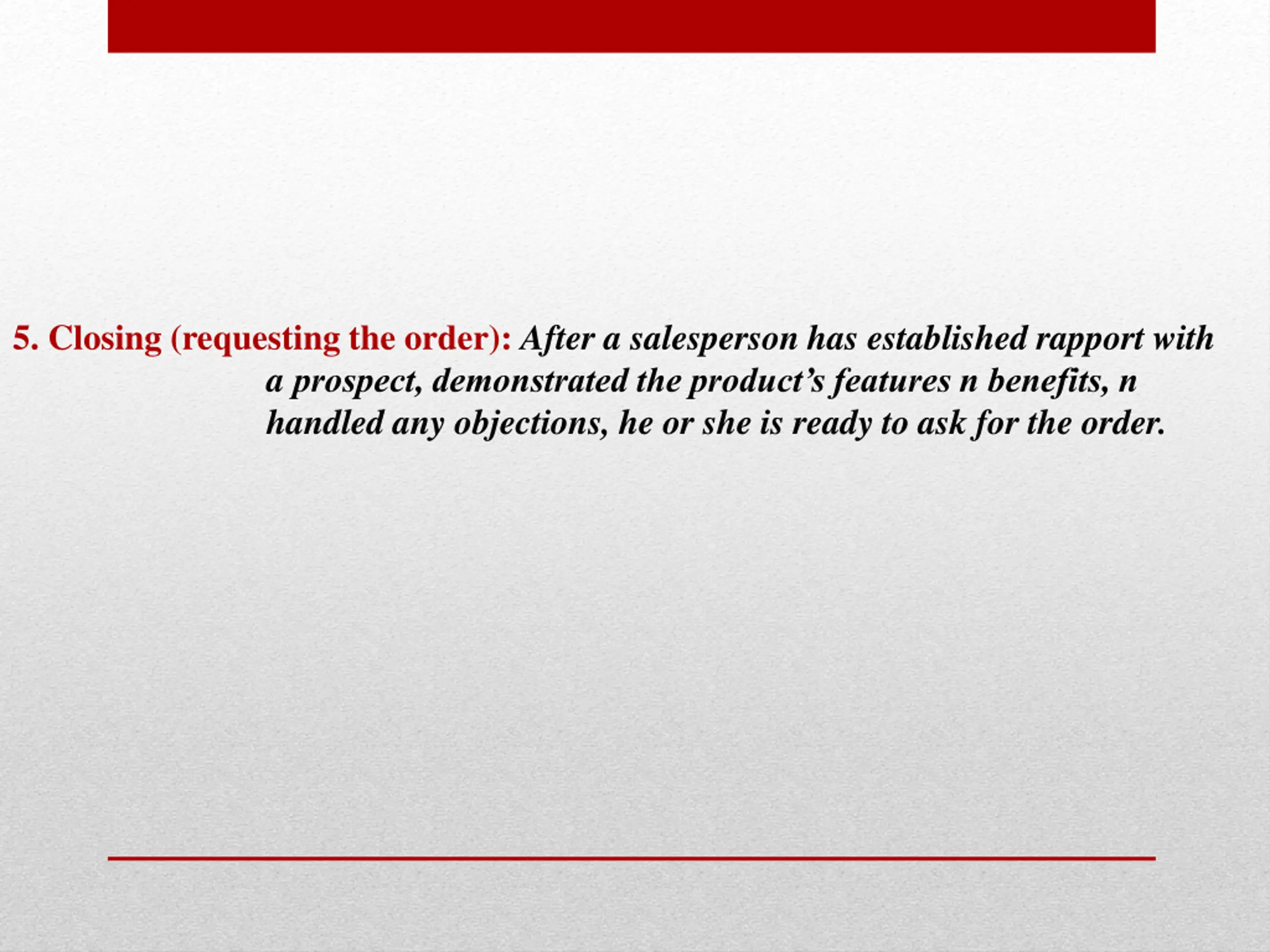 5. Closing (requesting the order): After a salesperson has established rapport with a prospect, demonstrated the product s features n benefits, n handled any objections, he or she is ready to ask for the order.