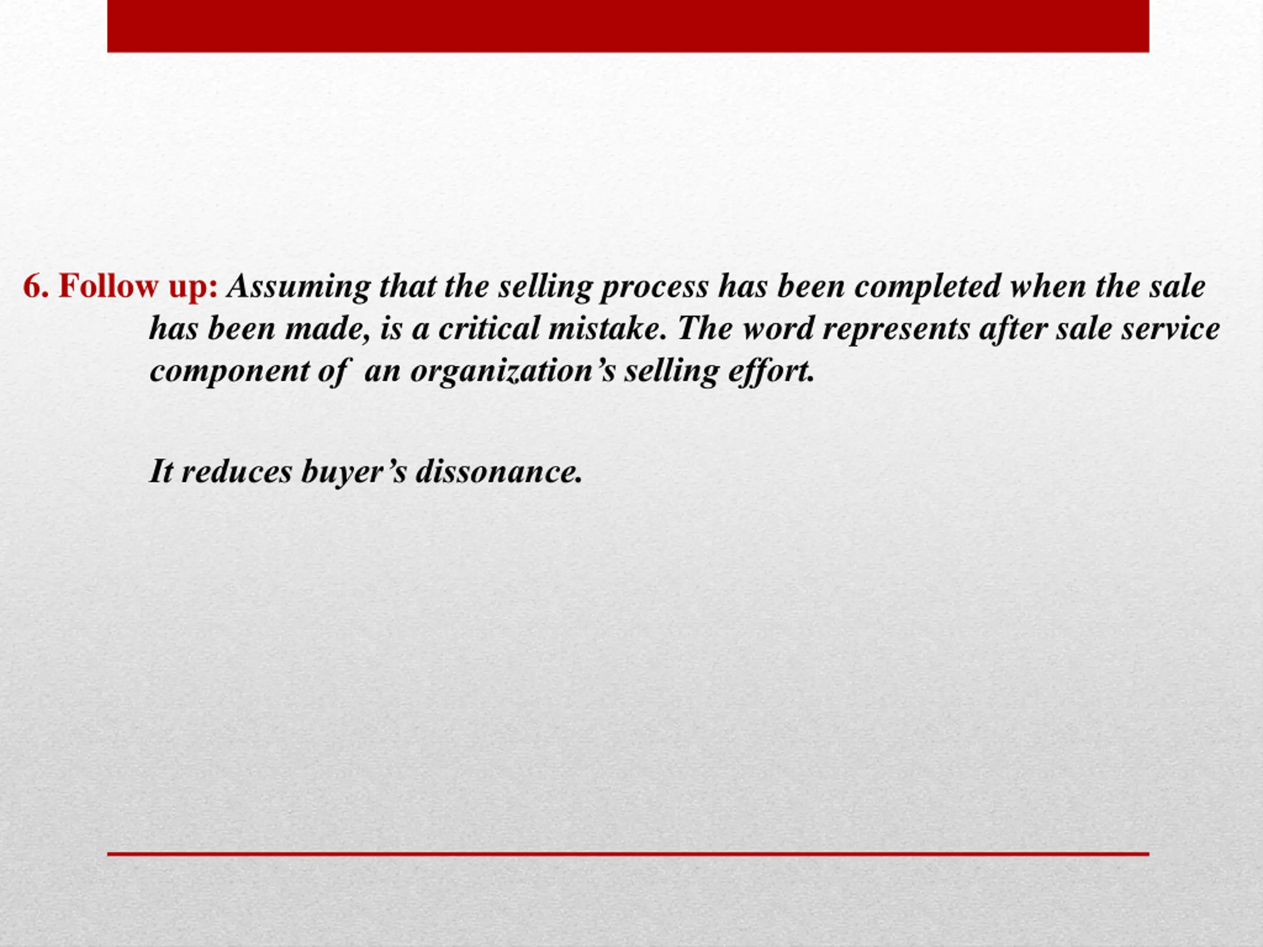 6. Follow up: Assuming that the selling process has been completed when the sale has been made, is a critical mistake. The word represents after sale service component of an organization s selling effort. It reduces buyer s dissonance.