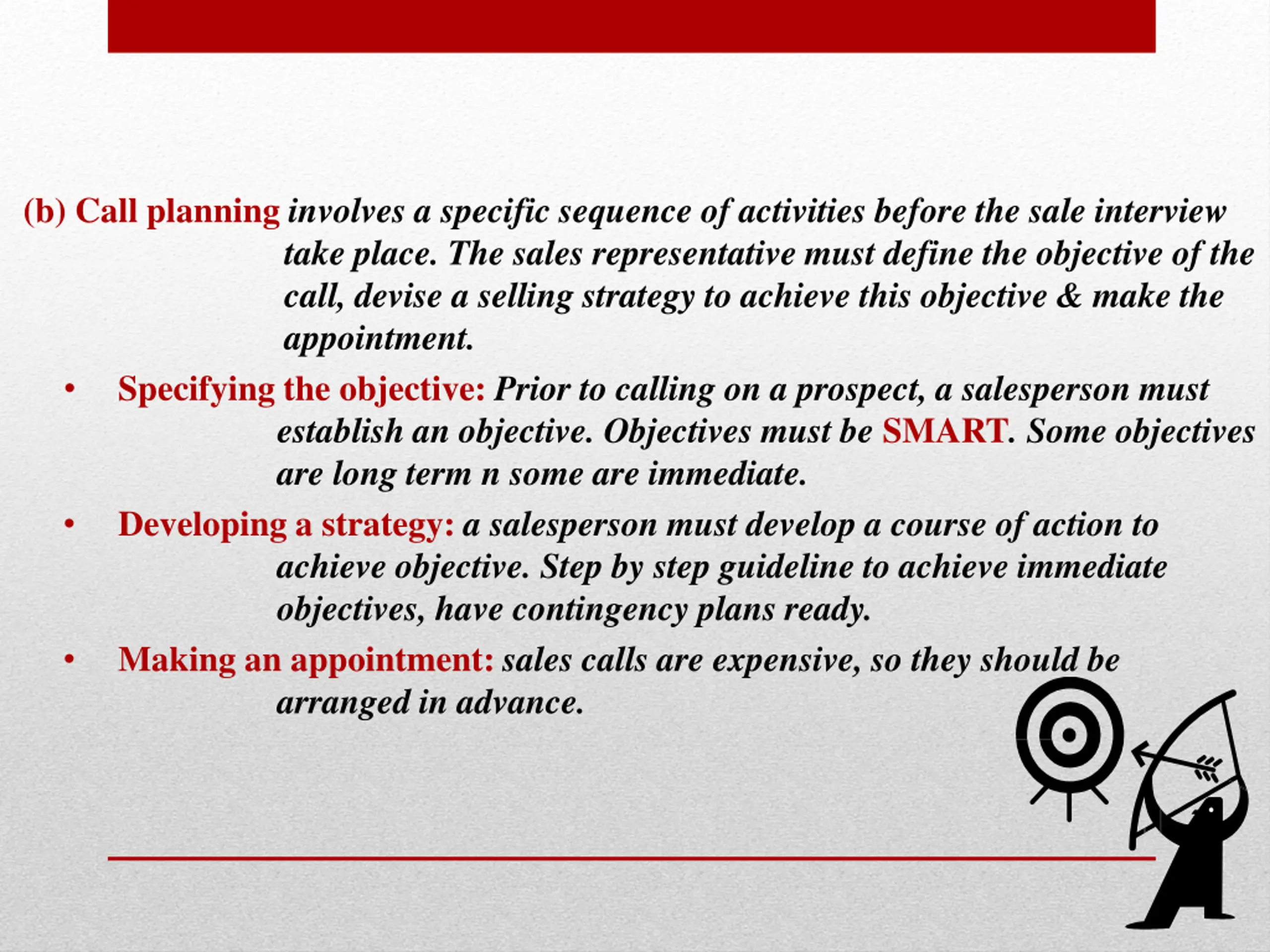 (b) Call planning involves a specific sequence of activities before the sale interview take place. The sales representative must define the objective of the call, devise a selling strategy to achieve this objective & make the appointment. Specifying the objective: Prior to calling on a prospect, a salesperson must establish an objective. Objectives must be SMART. Some objectives are long term n some are immediate. Developing a strategy: a salesperson must develop a course of action to achieve objective. Step by step guideline to achieve immediate objectives, have contingency plans ready. Making an appointment: sales calls are expensive, so they should be arranged in advance.