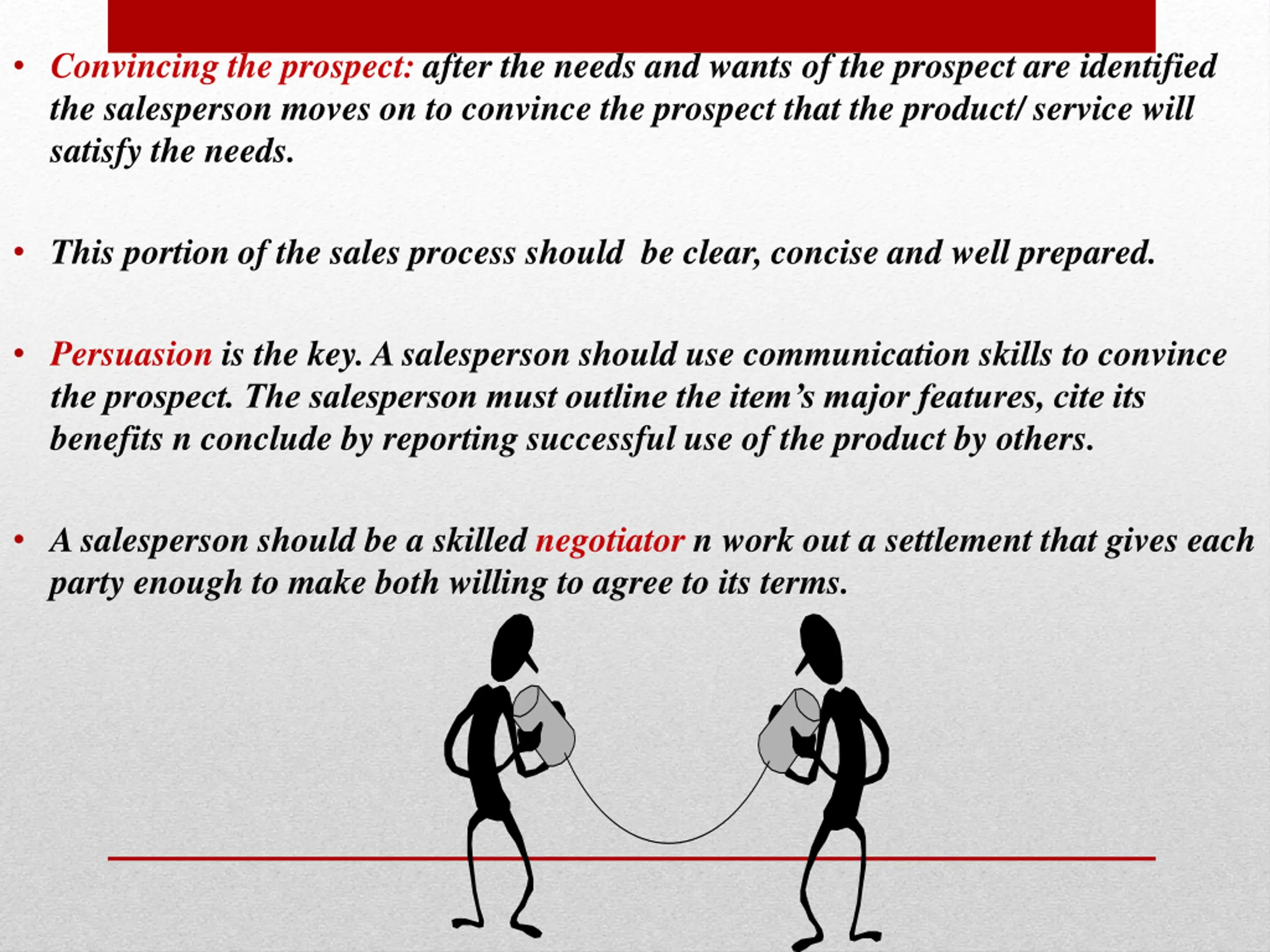 Convincing the prospect: after the needs and wants of the prospect are identified the salesperson moves on to convince the prospect that the product/ service will satisfy the needs. This portion of the sales process should be clear, concise and well prepared. Persuasion is the key. A salesperson should use communication skills to convince the prospect. The salesperson must outline the item s major features, cite its benefits n conclude by reporting successful use of the product by others. A salesperson should be a skilled negotiator n work out a settlement that gives each party enough to make both willing to agree to its terms.