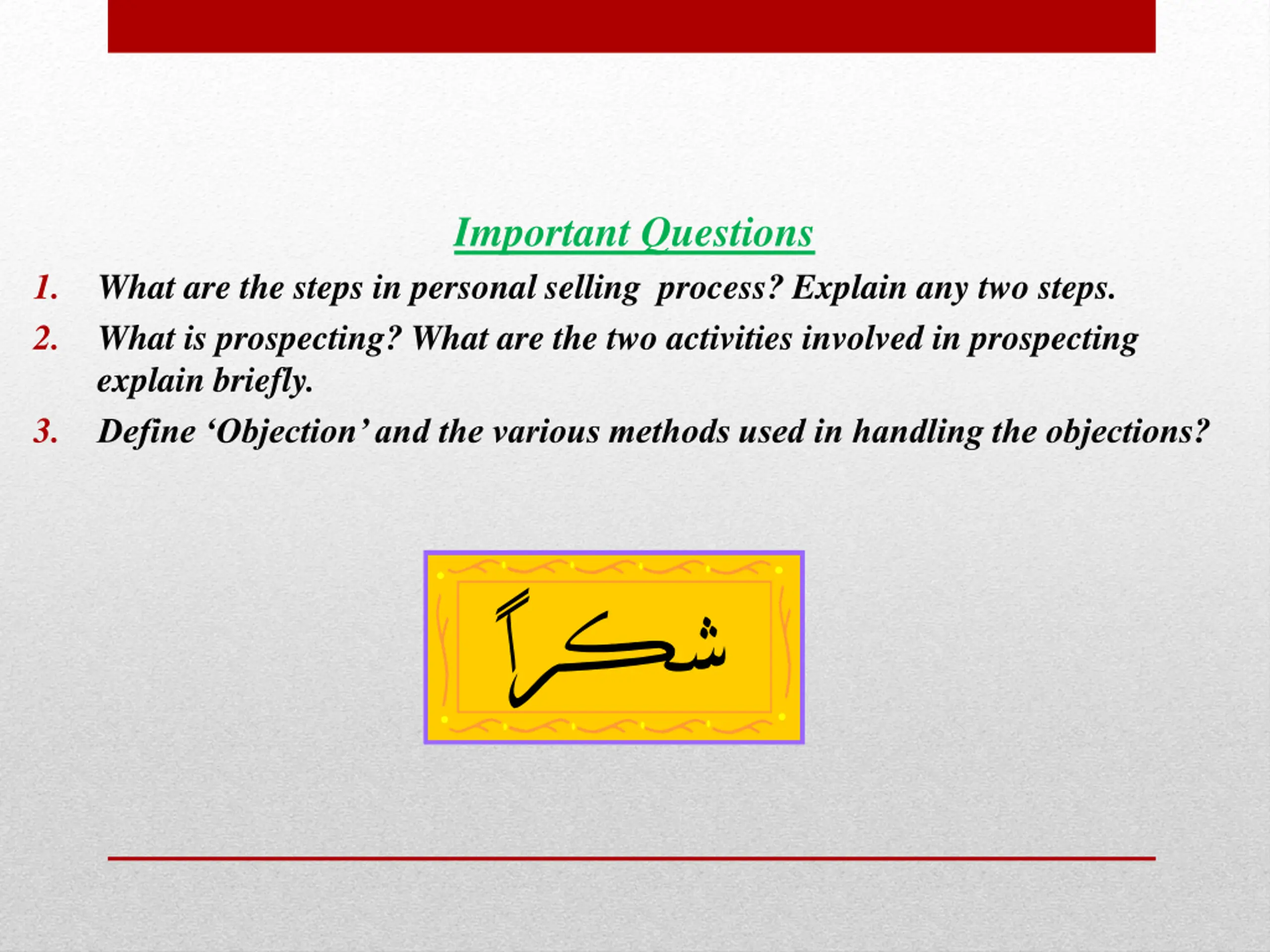 Important Questions 1. 2. What are the steps in personal selling process? Explain any two steps. What is prospecting? What are the two activities involved in prospecting explain briefly. Define Objection and the various methods used in handling the objections? 3.