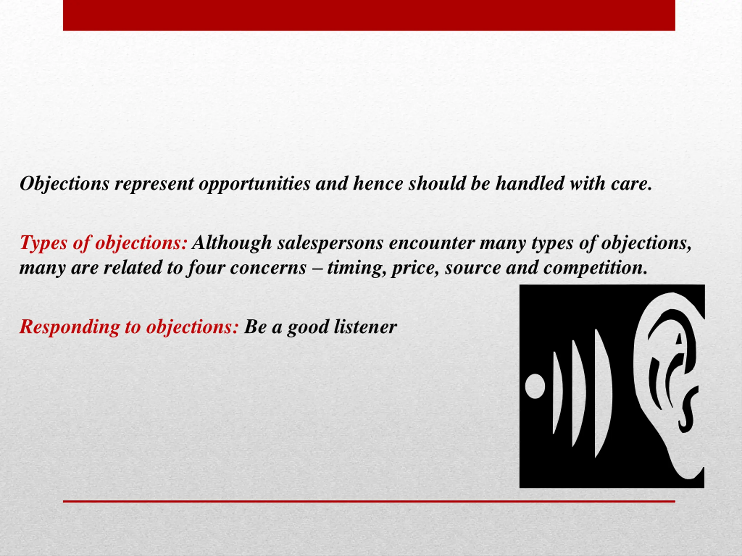 Objections represent opportunities and hence should be handled with care. Types of objections: Although salespersons encounter many types of objections, many are related to four concerns timing, price, source and competition. Responding to objections: Be a good listener