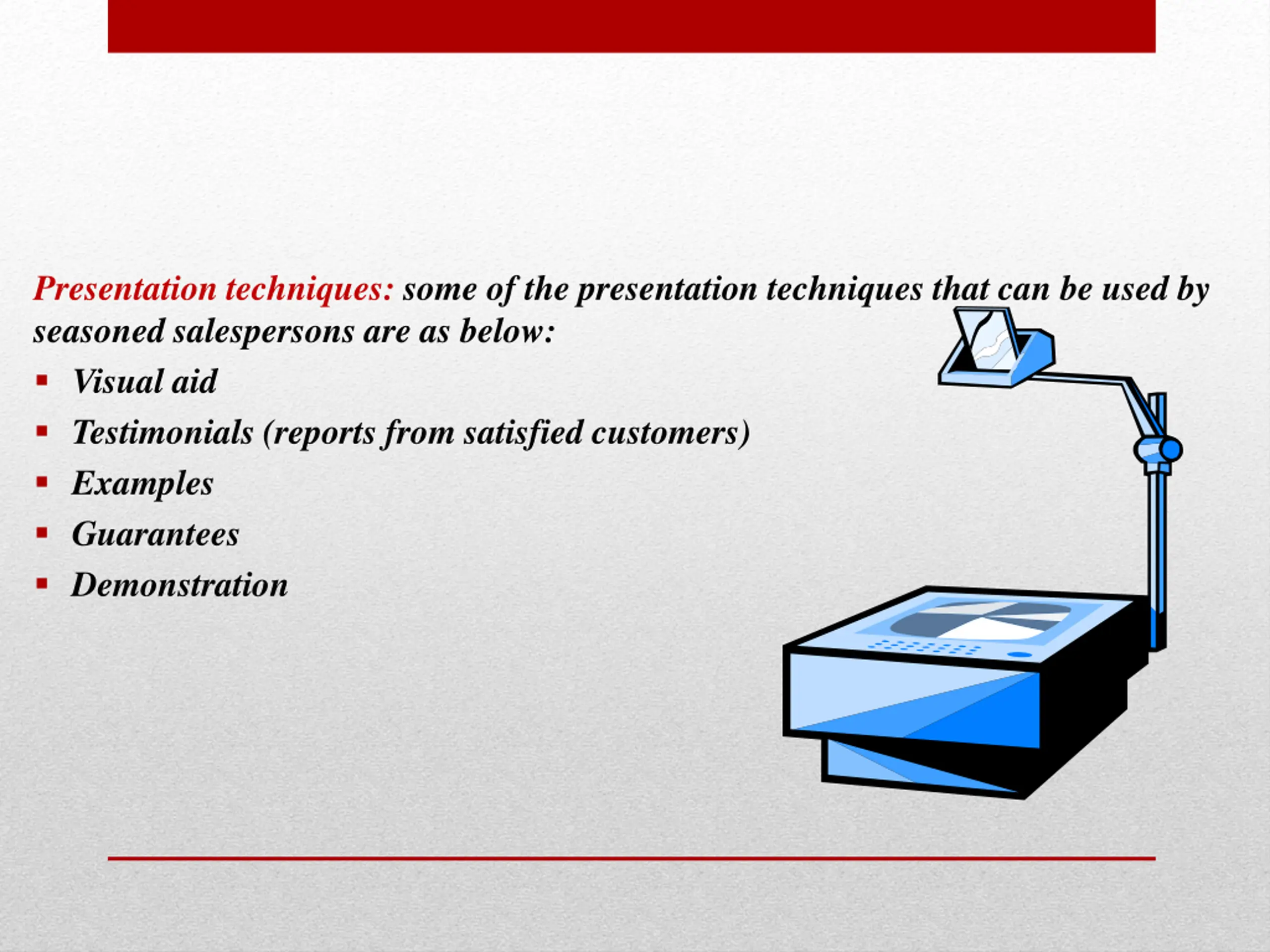 Presentation techniques: some of the presentation techniques that can be used by seasoned salespersons are as below: Visual aid Testimonials (reports from satisfied customers) Examples Guarantees Demonstration