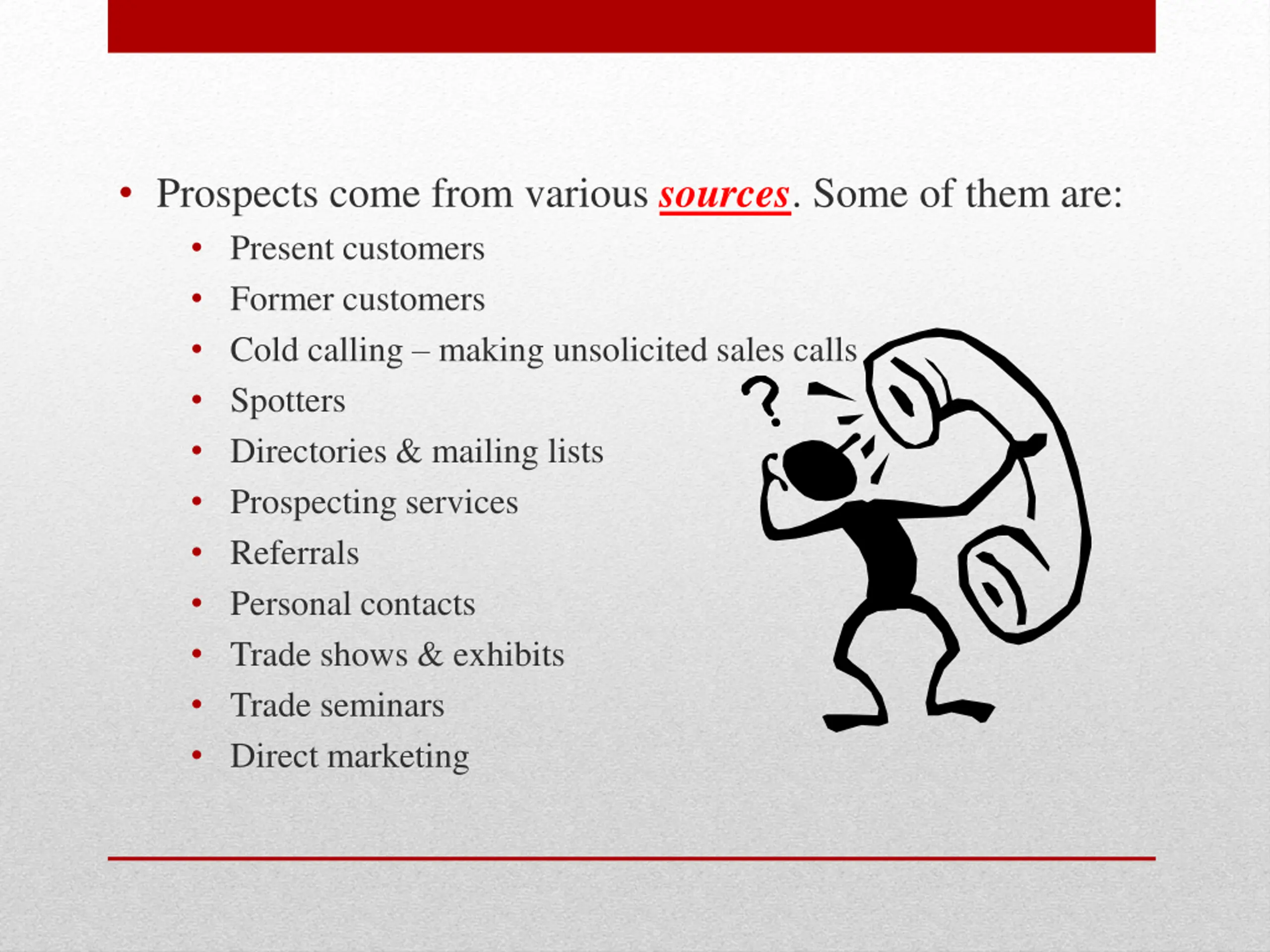 Prospects come from various sources. Some of them are: Present customers Former customers Cold calling making unsolicited sales calls Spotters Directories & mailing lists Prospecting services Referrals Personal contacts Trade shows & exhibits Trade seminars Direct marketing