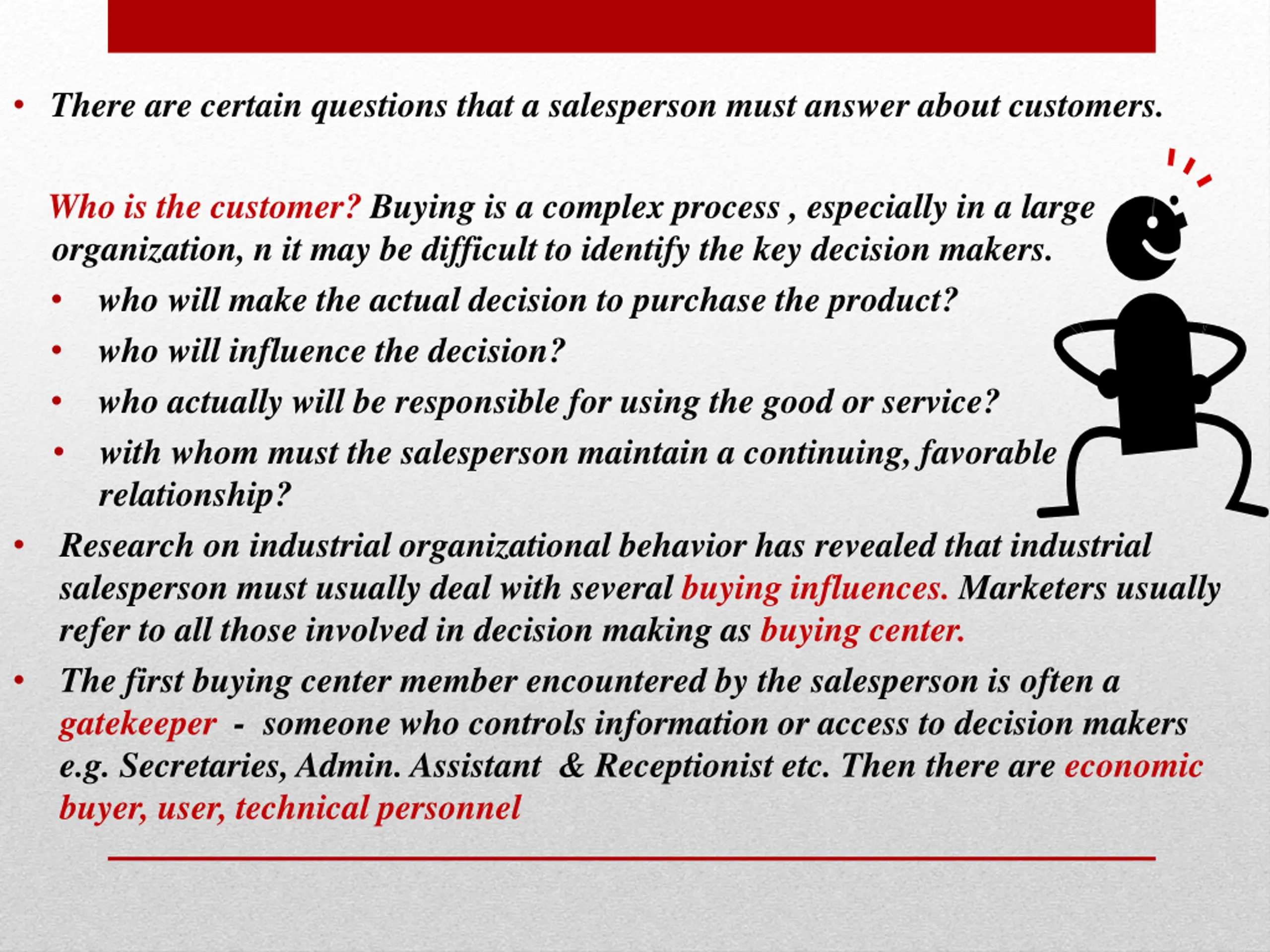 There are certain questions that a salesperson must answer about customers. Who is the customer? Buying is a complex process , especially in a large organization, n it may be difficult to identify the key decision makers. who will make the actual decision to purchase the product? who will influence the decision? who actually will be responsible for using the good or service? with whom must the salesperson maintain a continuing, favorable relationship? Research on industrial organizational behavior has revealed that industrial salesperson must usually deal with several buying influences. Marketers usually refer to all those involved in decision making as buying center. The first buying center member encountered by the salesperson is often a gatekeeper - someone who controls information or access to decision makers e.g. Secretaries, Admin. Assistant & Receptionist etc. Then there are economic buyer, user, technical personnel