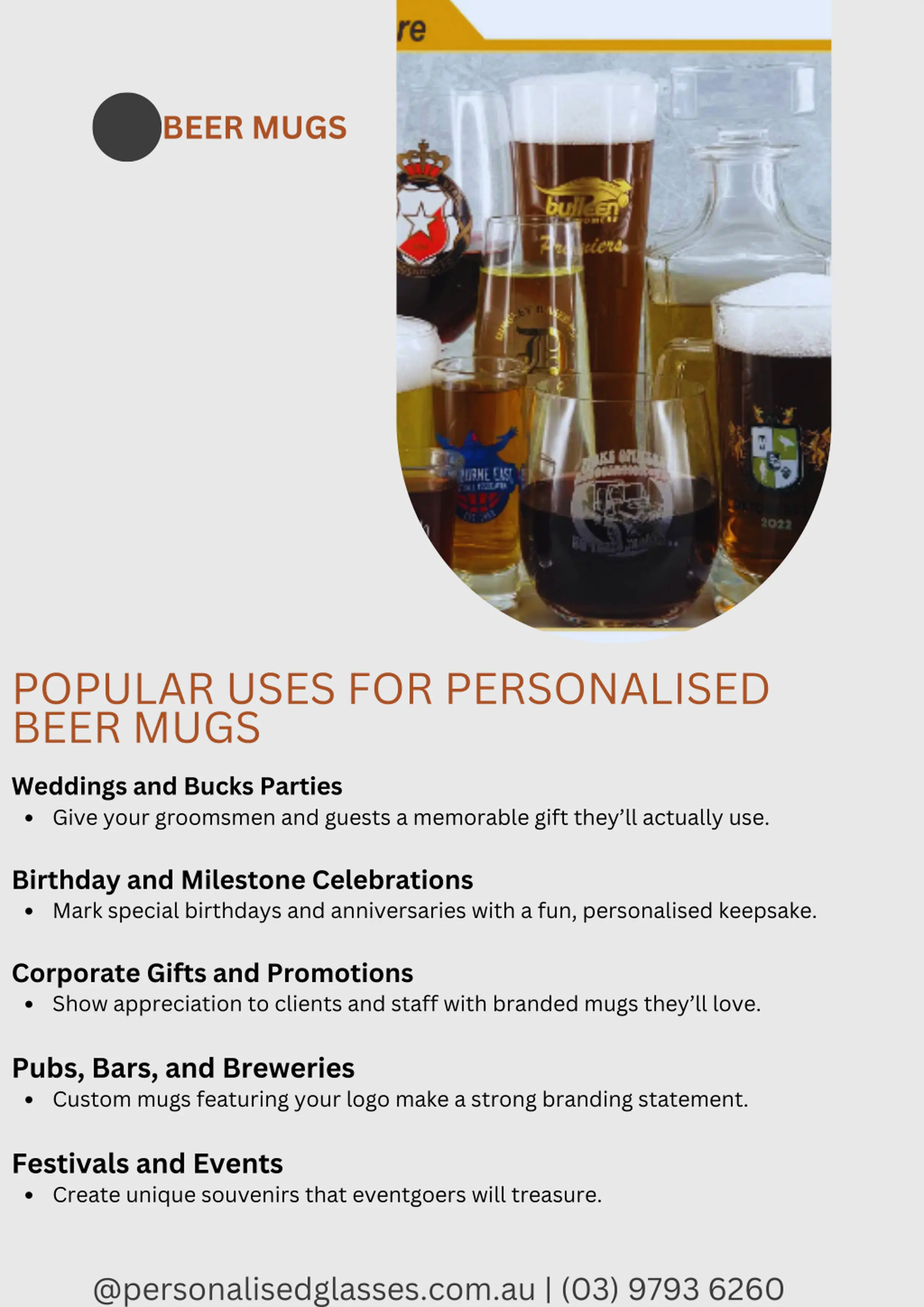 BEER MUGS POPULAR USES FOR PERSONALISED BEER MUGS Weddings and Bucks Parties Give your groomsmen and guests a memorable gift they ll actually use. Birthday and Milestone Celebrations Mark special birthdays and anniversaries with a fun, personalised keepsake. Corporate Gifts and Promotions Show appreciation to clients and staff with branded mugs they ll love. Pubs, Bars, and Breweries Custom mugs featuring your logo make a strong branding statement. Festivals and Events Create unique souvenirs that eventgoers will treasure. @personalisedglasses.com.au | (03) 9793 6260