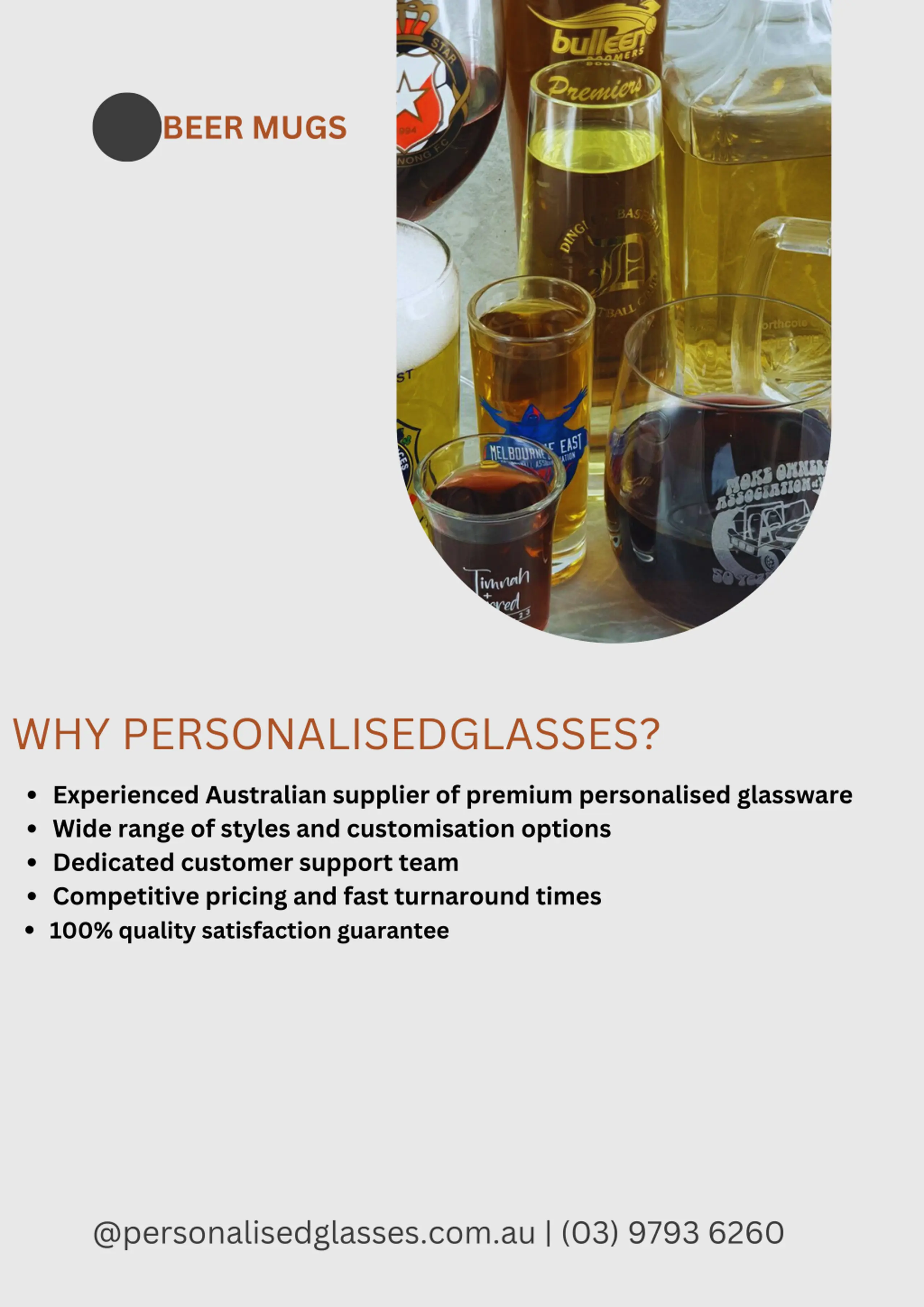 BEER MUGS WHY PERSONALISEDGLASSES? Experienced Australian supplier of premium personalised glassware Wide range of styles and customisation options Dedicated customer support team Competitive pricing and fast turnaround times 100% quality satisfaction guarantee @personalisedglasses.com.au | (03) 9793 6260