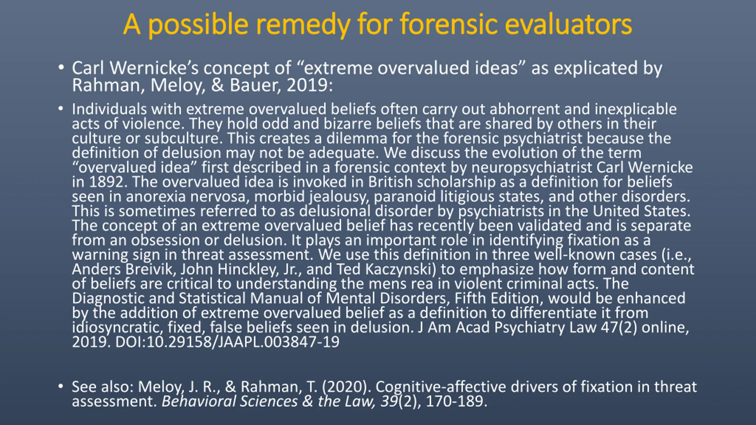 A possible remedy for forensic evaluators A possible remedy for forensic evaluators Carl Wernicke s concept of extreme overvalued ideas as explicated by Rahman, Meloy, & Bauer, 2019: Individuals with extreme overvalued beliefs often carry out abhorrent and inexplicable acts of violence. They hold odd and bizarre beliefs that are shared by others in their culture or subculture. This creates a dilemma for the forensic psychiatrist because the definition of delusion may not be adequate. We discuss the evolution of the term overvalued idea first described in a forensic context by neuropsychiatrist Carl Wernicke in 1892. The overvalued idea is invoked in British scholarship as a definition for beliefs seen in anorexia nervosa, morbid jealousy, paranoid litigious states, and other disorders. This is sometimes referred to as delusional disorder by psychiatrists in the United States. The concept of an extreme overvalued belief has recently been validated and is separate from an obsession or delusion. It plays an important role in identifying fixation as a warning sign in threat assessment. We use this definition in three well-known cases (i.e., Anders Breivik, John Hinckley, Jr., and Ted Kaczynski) to emphasize how form and content of beliefs are critical to understanding the mens rea in violent criminal acts. The Diagnostic and Statistical Manual of Mental Disorders, Fifth Edition, would be enhanced by the addition of extreme overvalued belief as a definition to differentiate it from idiosyncratic, fixed, false beliefs seen in delusion. J Am Acad Psychiatry Law 47(2) online, 2019. DOI:10.29158/JAAPL.003847-19 See also: Meloy, J. R., & Rahman, T. (2020). Cognitive-affective drivers of fixation in threat assessment. Behavioral Sciences & the Law, 39(2), 170-189.