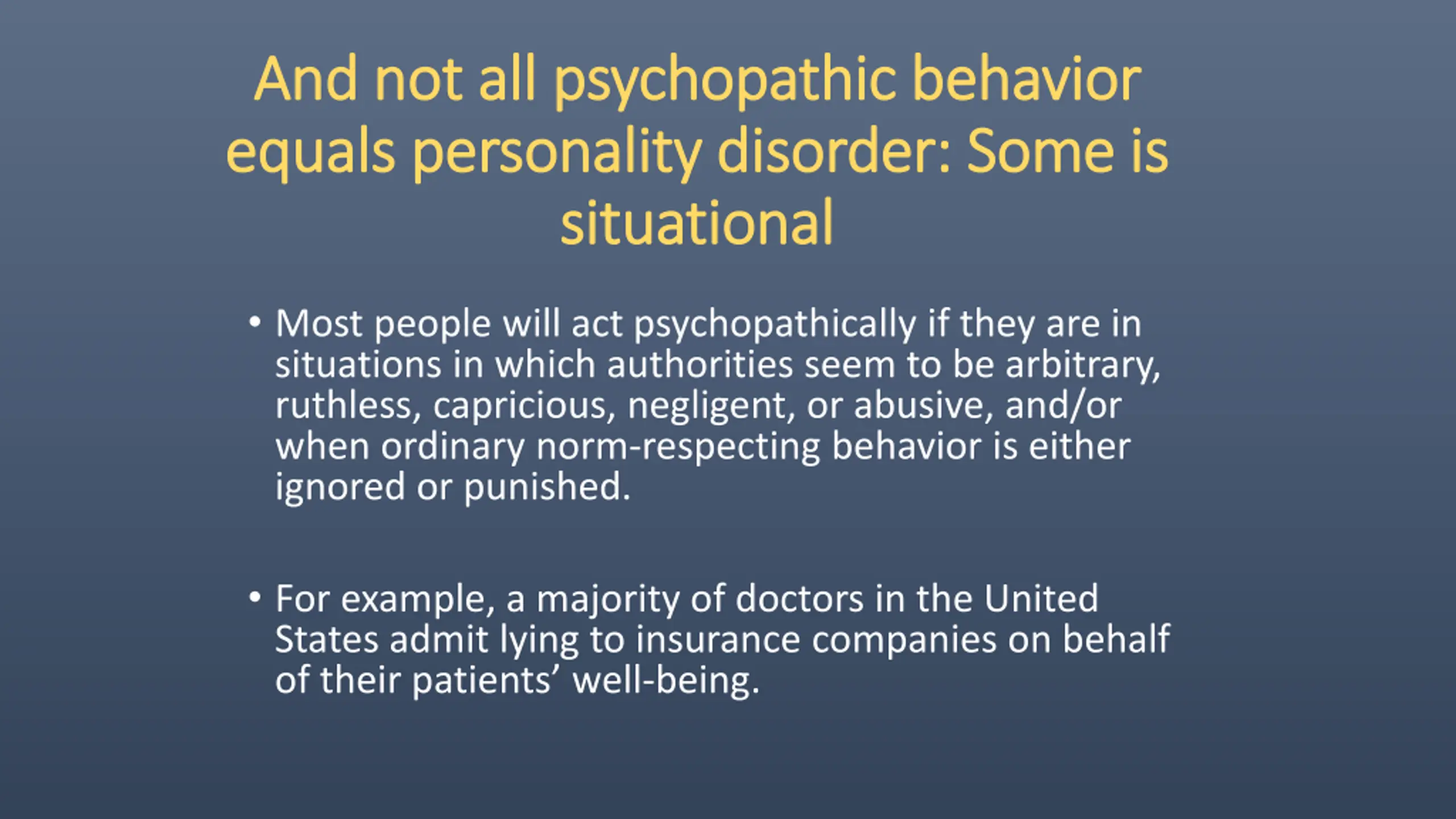 And not all psychopathic behavior And not all psychopathic behavior equals personality disorder: Some is equals personality disorder: Some is situational situational Most people will act psychopathically if they are in situations in which authorities seem to be arbitrary, ruthless, capricious, negligent, or abusive, and/or when ordinary norm-respecting behavior is either ignored or punished. For example, a majority of doctors in the United States admit lying to insurance companies on behalf of their patients well-being.