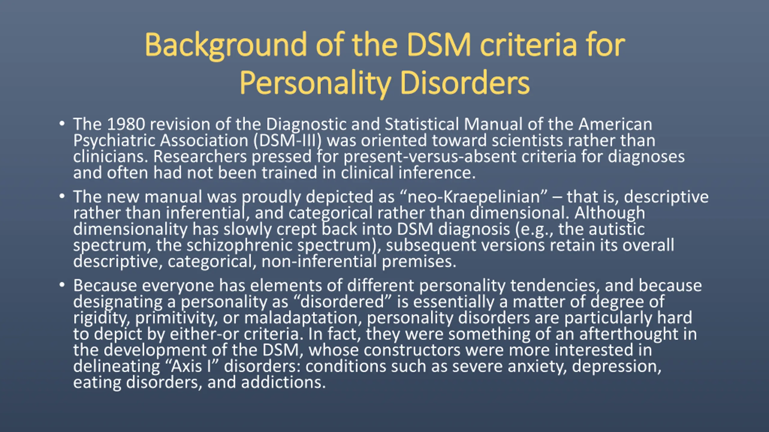 Background of the DSM criteria for Background of the DSM criteria for Personality Disorders Personality Disorders The 1980 revision of the Diagnostic and Statistical Manual of the American Psychiatric Association (DSM-III) was oriented toward scientists rather than clinicians. Researchers pressed for present-versus-absent criteria for diagnoses and often had not been trained in clinical inference. The new manual was proudly depicted as neo-Kraepelinian that is, descriptive rather than inferential, and categorical rather than dimensional. Although dimensionality has slowly crept back into DSM diagnosis (e.g., the autistic spectrum, the schizophrenic spectrum), subsequent versions retain its overall descriptive, categorical, non-inferential premises. Because everyone has elements of different personality tendencies, and because designating a personality as disordered is essentially a matter of degree of rigidity, primitivity, or maladaptation, personality disorders are particularly hard to depict by either-or criteria. In fact, they were something of an afterthought in the development of the DSM, whose constructors were more interested in delineating Axis I disorders: conditions such as severe anxiety, depression, eating disorders, and addictions.