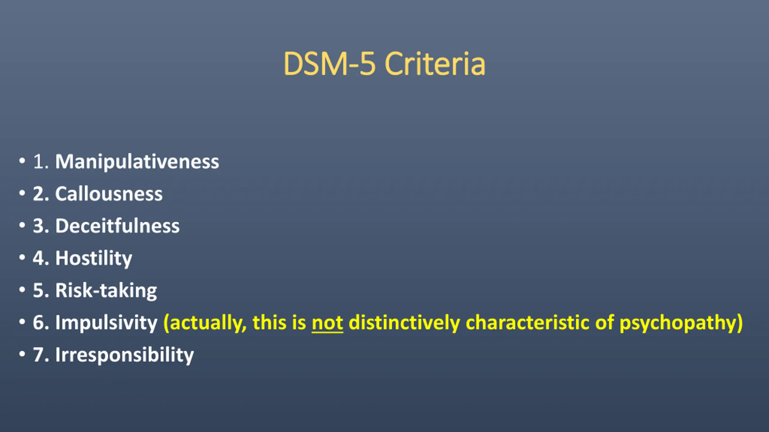 DSM DSM- -5 Criteria 5 Criteria 1. Manipulativeness 2. Callousness 3. Deceitfulness 4. Hostility 5. Risk-taking 6. Impulsivity (actually, this is not distinctively characteristic of psychopathy) 7. Irresponsibility