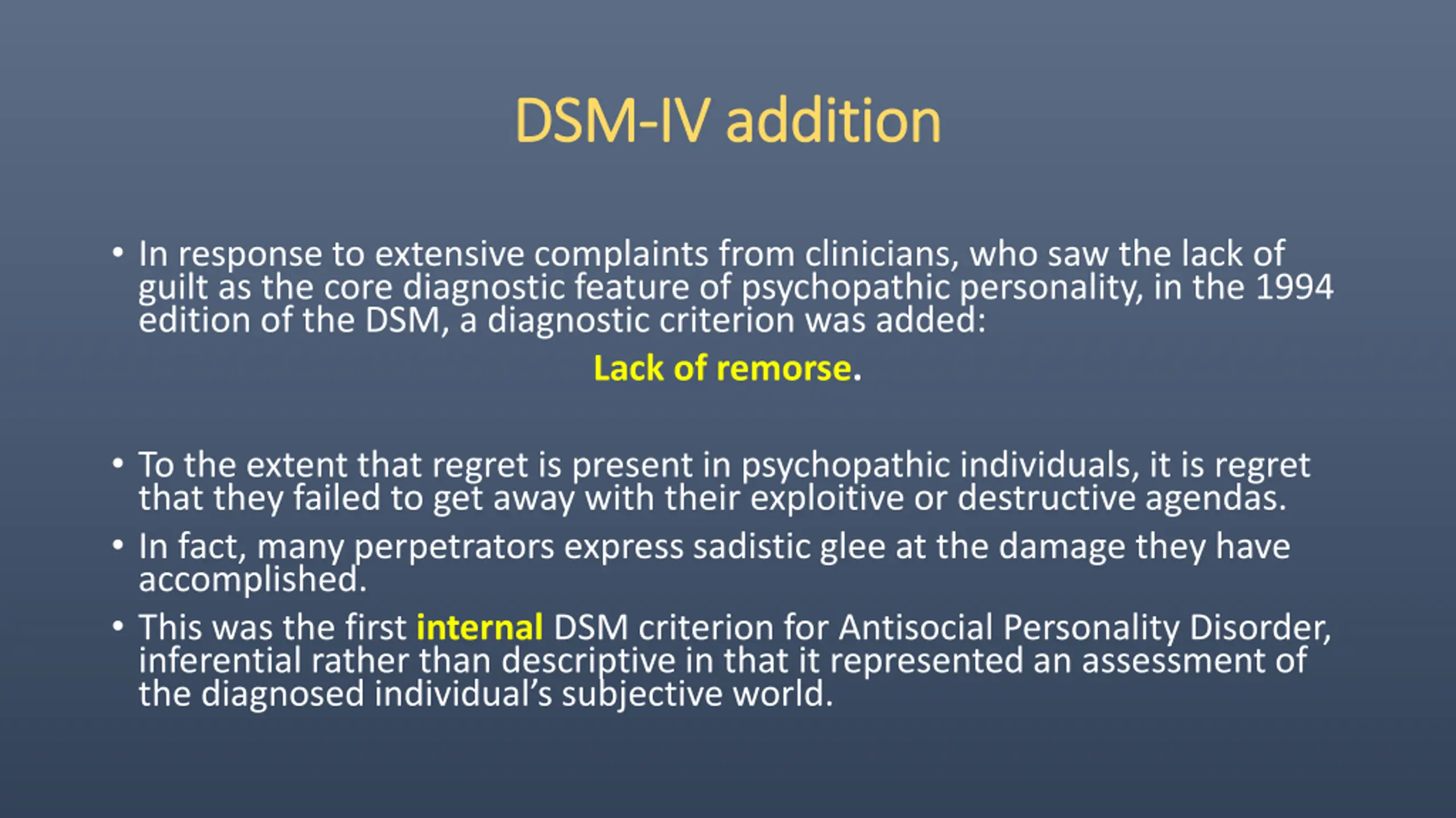 DSM DSM- -IV addition IV addition In response to extensive complaints from clinicians, who saw the lack of guilt as the core diagnostic feature of psychopathic personality, in the 1994 edition of the DSM, a diagnostic criterion was added: Lack of remorse. To the extent that regret is present in psychopathic individuals, it is regret that they failed to get away with their exploitive or destructive agendas. In fact, many perpetrators express sadistic glee at the damage they have accomplished. This was the first internal DSM criterion for Antisocial Personality Disorder, inferential rather than descriptive in that it represented an assessment of the diagnosed individual s subjective world.
