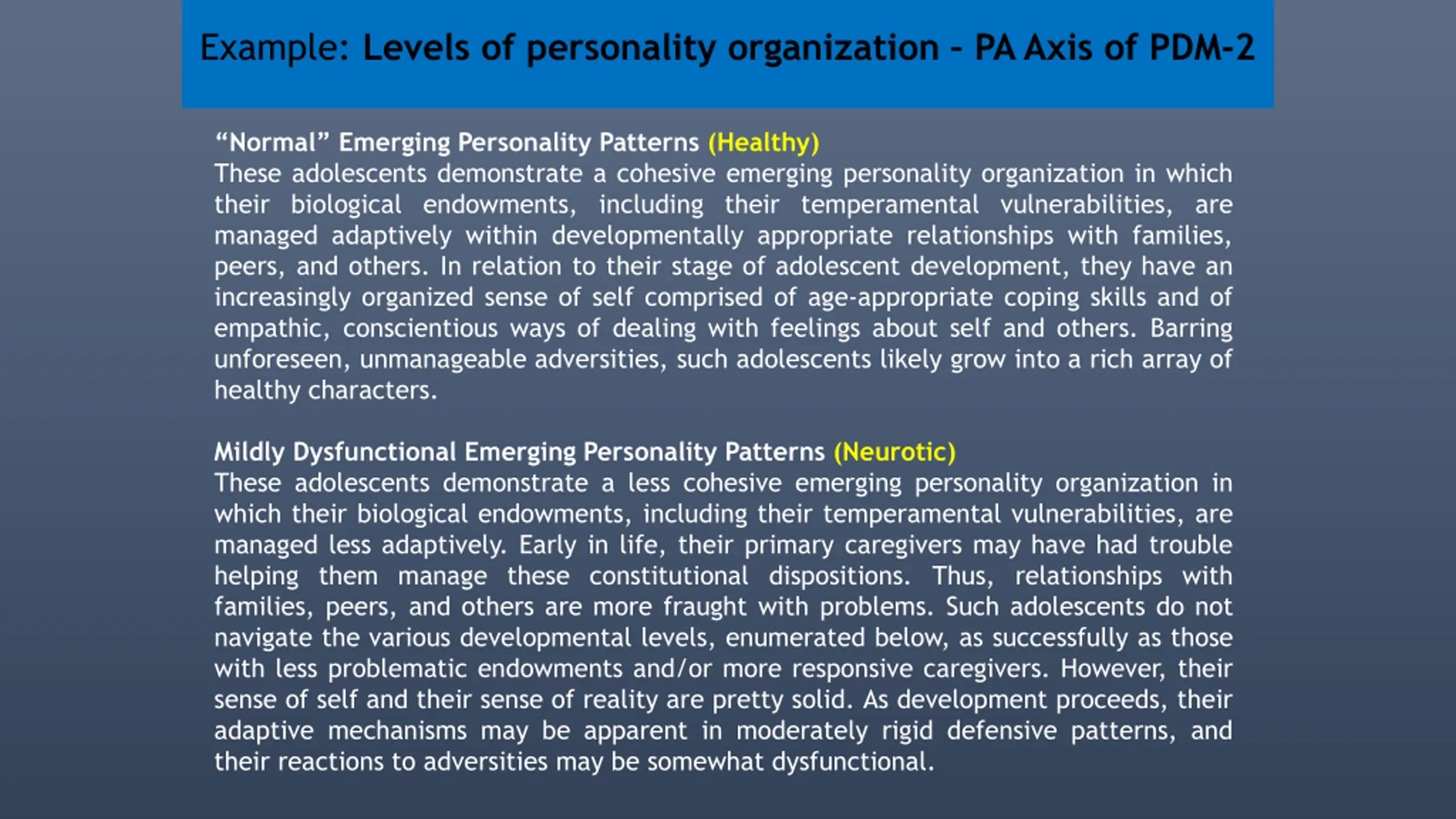 Example: Levels of personality organization PA Axis of PDM-2 Normal Emerging Personality Patterns (Healthy) These adolescents demonstrate a cohesive emerging personality organization in which their biological endowments, including their temperamental vulnerabilities, are managed adaptively within developmentally appropriate relationships with families, peers, and others. In relation to their stage of adolescent development, they have an increasingly organized sense of self comprised of age-appropriate coping skills and of empathic, conscientious ways of dealing with feelings about self and others. Barring unforeseen, unmanageable adversities, such adolescents likely grow into a rich array of healthy characters. Mildly Dysfunctional Emerging Personality Patterns (Neurotic) These adolescents demonstrate a less cohesive emerging personality organization in which their biological endowments, including their temperamental vulnerabilities, are managed less adaptively. Early in life, their primary caregivers may have had trouble helping them manage these constitutional dispositions. Thus, relationships with families, peers, and others are more fraught with problems. Such adolescents do not navigate the various developmental levels, enumerated below, as successfully as those with less problematic endowments and/or more responsive caregivers. However, their sense of self and their sense of reality are pretty solid. As development proceeds, their adaptive mechanisms may be apparent in moderately rigid defensive patterns, and their reactions to adversities may be somewhat dysfunctional.