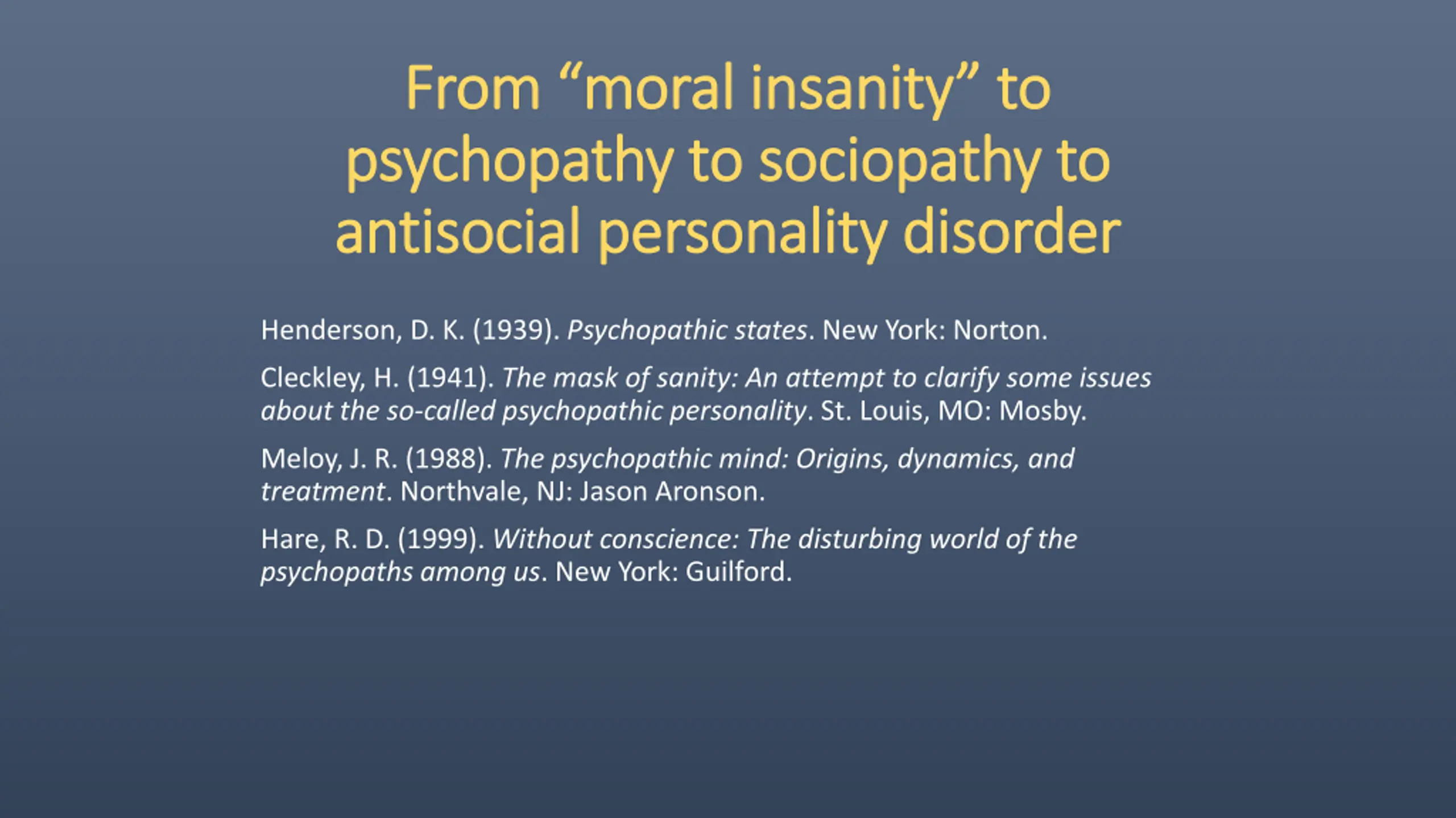 From moral insanity to From moral insanity to psychopathy to sociopathy to psychopathy to sociopathy to antisocial personality disorder antisocial personality disorder Henderson, D. K. (1939). Psychopathic states. New York: Norton. Cleckley, H. (1941). The mask of sanity: An attempt to clarify some issues about the so-called psychopathic personality. St. Louis, MO: Mosby. Meloy, J. R. (1988). The psychopathic mind: Origins, dynamics, and treatment. Northvale, NJ: Jason Aronson. Hare, R. D. (1999). Without conscience: The disturbing world of the psychopaths among us. New York: Guilford.